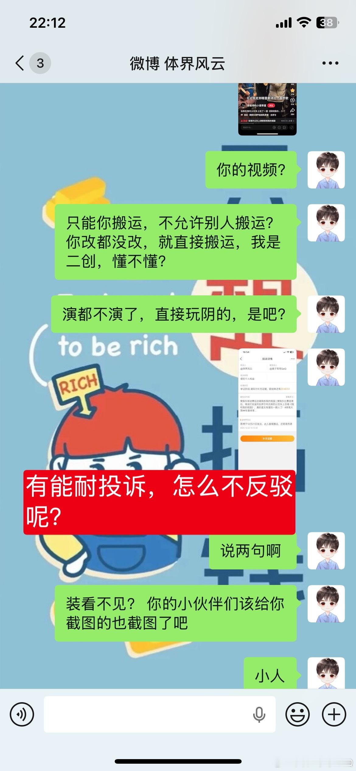 玩微博这么多年第一次遇到这么恶心人的事搬运别人小红书的原创说她是自己的,还舔着脸来举报我抄袭她,老子好歹也是二创,你有什么资格来投诉啊真是可笑,小人一个。最恶心的是还有微信好友,被我怼的一句话不敢说,交友不慎啊背地里阴的,最无耻。