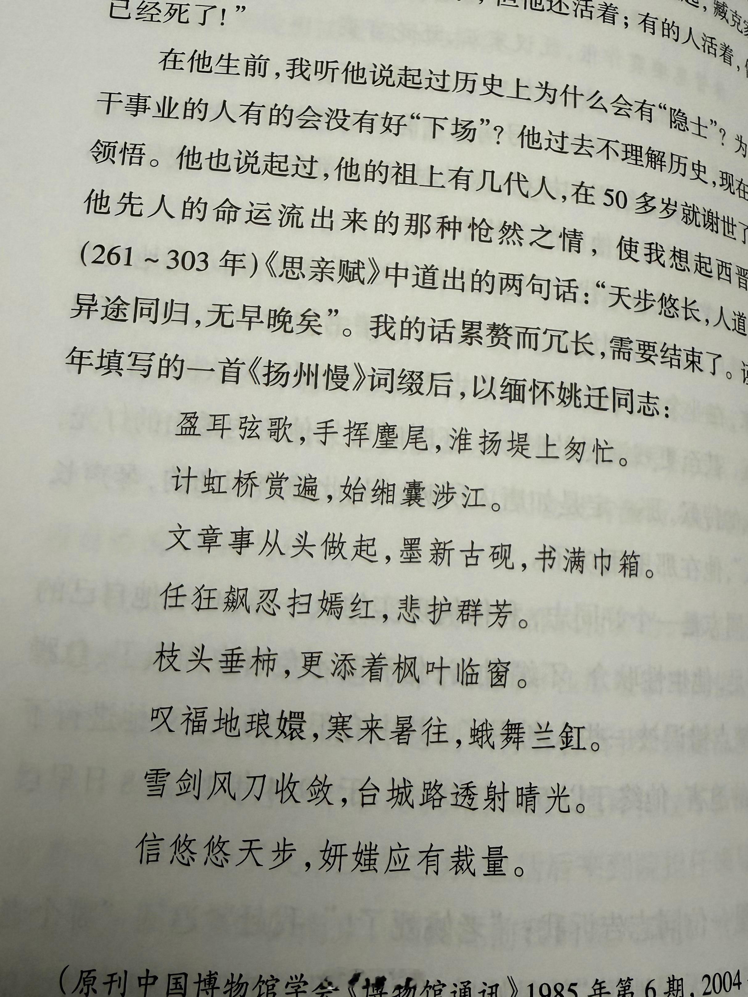 睹近事,抚两册旧书,《姚迁纪念文集》是梁白泉先生所赠,另赠的还有曾、梁的两套新版文集。曾院长之死,梁先生曾经对作家岳南详细讲了来龙去脉,姚迁之死梁先生也曾向我讲了详细的来龙去脉,好在当时都存了口述史录音。《纪念文集》中有江苏的一位作家庞瑞垠所写的《姚迁之死》,发表于八五年第八期《文汇》月刊,也是最详实的记录。可供参考,近乎信史。梁先生于姚迁,感情极深,睹当年一首挽词《扬州慢》可知:「盈耳弦歌,手挥麈尾,淮扬堤上匆忙。计虹桥赏遍,始缃囊涉江。文章事从头做起,墨新古砚,书满巾箱。任狂飙忍扫嫣红,悲护群芳。枝头垂柿,更添着枫叶临窗。叹福地琅嬛,寒来暑往,蛾舞兰釭。雪剑风刀收敛,台城路透射晴光。信悠悠天步,妍媸应有裁量。 」人间的许多事,真是有无限的因缘和因果,难以捉摸和裁量。。。