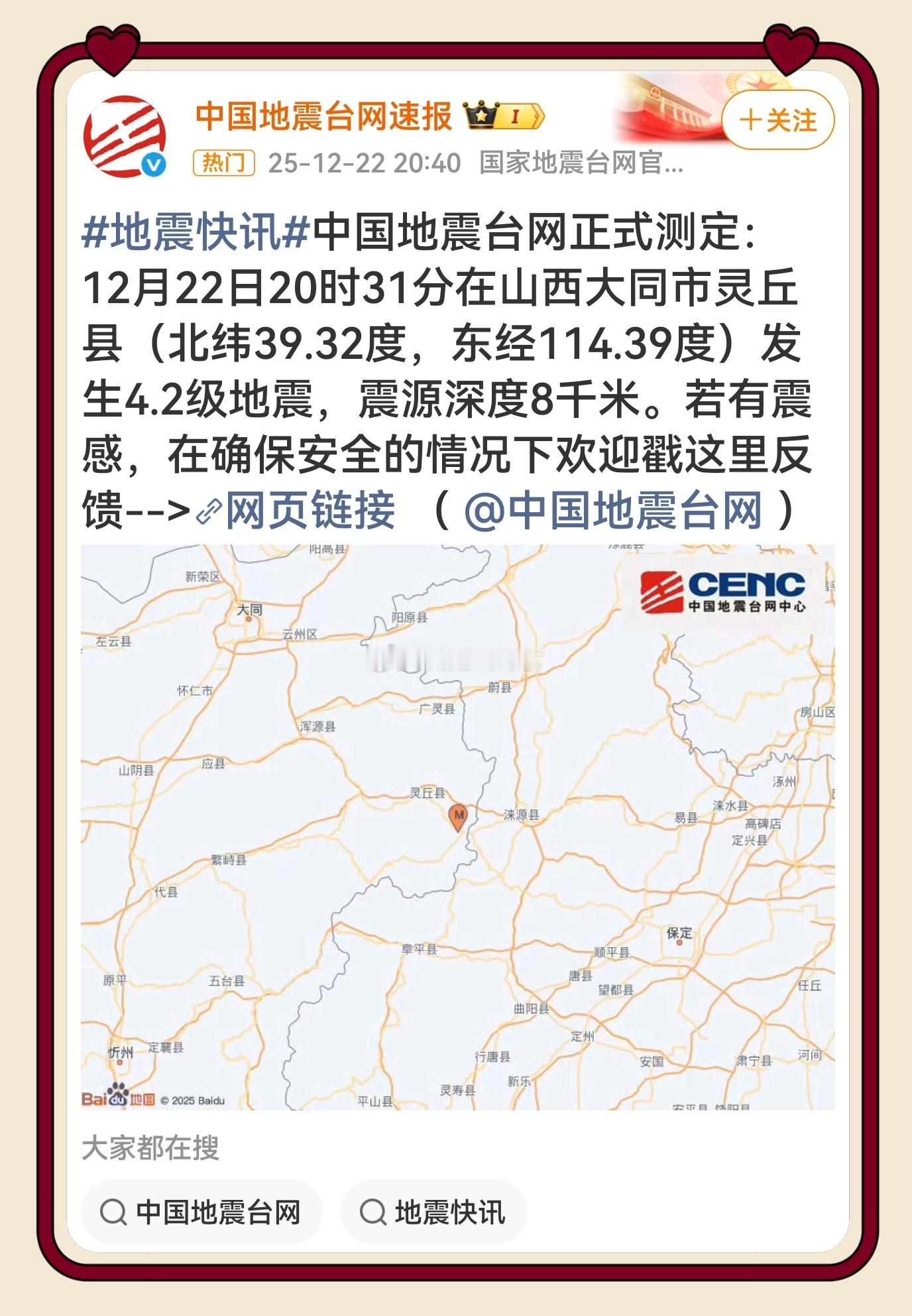 大同地震 【山西灵丘4.2级浅源地震波及京津冀】12月22日20时31分,大同灵丘县发生4.2级地震,震源深度仅8千米!当地震感强烈,200公里外北京、石家庄等多地高层均有晃动反馈,网友晒出地震预警截图。官方通报无人员伤亡及重大财产损失,应急部门已连夜排查隐患🙏 灵丘地震京津冀震感 锦州·锦州市自媒体协会