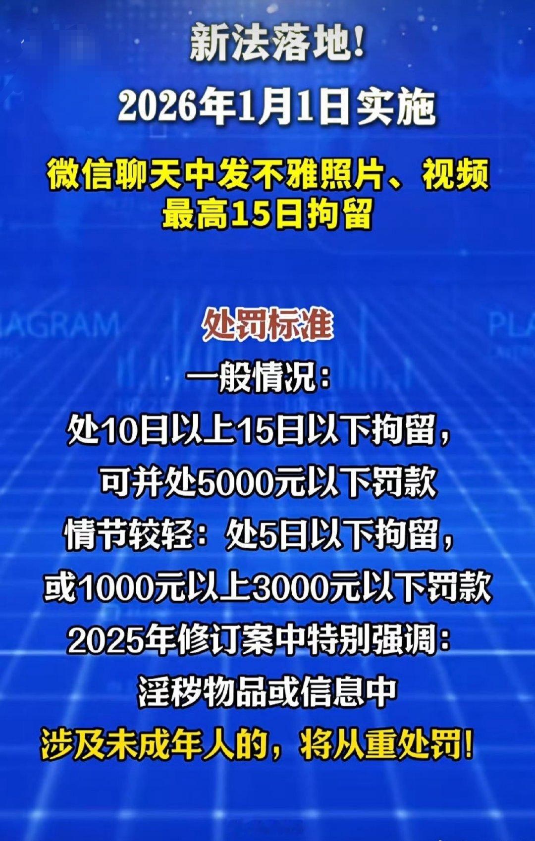 重点提醒:【明年起向好友发淫秽信息违法】微信发淫秽小视频给好友构成犯罪 从2026年1月1日 起,新修订的《治安管理处罚法》将正式施行。其中最大的变化是:删除了传播场景的限制。明年起发淫秽信息违法这意味着,无论是在公开群聊,还是一对一私聊(微信、QQ等),只要利用网络传输淫秽信息,一旦查实,都将面临法律制裁。这打破了以往“私下传播只是道德问题”的认知误区。️ 法律后果:分清“行政违法”与“刑事犯罪”根据情节轻重,法律设置了两道门槛,请务必注意区分:1. 行政处罚(情节较轻)只要是利用网络、电话等工具传播淫秽信息,无论公私场合:处罚: 处 10日以上15日以下拘留,可以并处 5000元以下罚款。情节较轻: 处 5日以下拘留 或 1000元以上3000元以下罚款。2. 刑事犯罪(情节严重)如果行为达到“情节严重”标准,或者以牟利为目的,将面临牢狱之灾:非牟利但数量大: 例如向他人传播淫秽视频数量达一定标准(如40个以上),或建立主要用于传播的群组(成员30人以上),构成传播淫秽物品罪,最高可判2年。以牟利为目的: 例如通过“众筹合购”、打赏链接、直播收费等方式传播,构成传播淫秽物品牟利罪。获利5000元以上即可定罪,情节严重的(如获利3万-5万元以上),量刑将大幅加重,最高可至无期徒刑。️ 特别警示:这些角色也跑不掉除了直接发送的人,以下情况同样面临法律风险:群主/管理员“不作为”也是犯罪:如果你是群主,明知群内有人发“黄”却不管理(不踢人、不删帖),被视为放任违法。一旦群内传播数量较大,群主将与传播者一同被追究刑事责任。涉及未成年人将“从重处罚”:如果传播的内容涉及未成年人,或者向未成年人传播,法律将从重处罚。这是法律划定的绝对红线。真实案例警示私聊转发被判刑: 广东惠州一名男子仅因给好友微信转发了54个淫秽视频(未牟利),就被法院以传播淫秽物品罪判刑。群主放任获刑: 广东清远三名QQ群管理员,因放任400多人的群内传播200多部淫秽视频,分别被判处 10个月至1年 有期徒刑。一句话总结: 网络空间不是法外之地。从2026年起,即使是私下发给好友,只要传播了,就是违法;如果数量多或为了赚钱,就是犯罪。请洁身自好,远离法律红线。专栏 · 乱相百态 | 社会热点 | 改开隐患