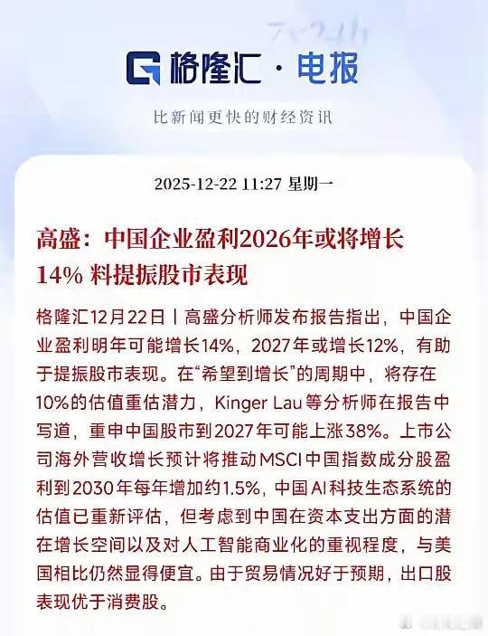国外大机构预测到2027年中国股市能够上涨38%高盛表示:中国企业2026年能够整体盈利14%,这也是A股上涨的原因。出口股优于消费股。事实上今年中国企业盈利能力就在回升,股市也从3000点涨到了现在的3900点。但大部分的都是科技股的上涨,其他板块并没有上涨。即使明天中国企业能够盈利能力能够达到14%,股市也不会出现普涨的情况,还会以市场热度为主,就像今年的人工智能一样。买对的能够赚钱,买错的即使在牛市当中也是赔钱。