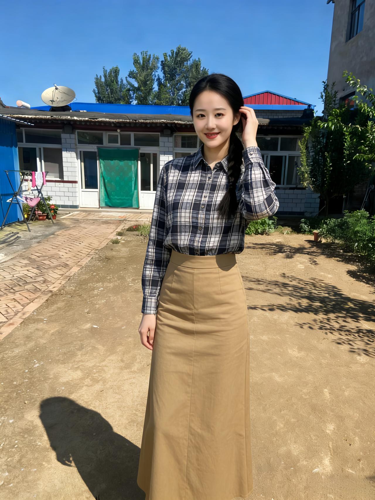 格衫卡其裙曳地,晴光满院草萋萋。 无端一顾惊乡野,笑里春风拂柳堤。