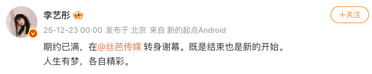 李艺彤官宣离开丝芭 李艺彤生日发文:“期约已满,在转身谢幕。既是结束也是新的开始。人生有梦,各自精彩。 ”