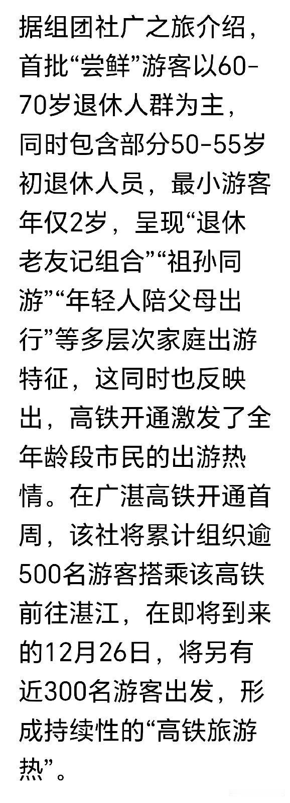 广湛高铁刚刚正式通车,预期的效果就立刻产生了,广州旅游团纷纷组织旅客乘高铁来湛江旅游!可以预见,未来还有更多这样的旅游团和旅客蜂拥而至。请湛江的景区和商家做好准备,提供优质服务,特别是平靓正的湛江海鲜美食,很大可能成为这些旅客的目标!千万不能出现宰客现象,只有把湛江的旅游市场经营好,才有源源不断的旅游团来湛江,把湛江的旅游市场的蛋糕做大。因为广州旅游团之后,大湾区其它市的旅游团也会过来,特别是周末、其他假期,旅游团和旅客肯定更多。湛江文旅部门赶快做好湛江旅游的指引,给旅游团或者旅客推荐湛江景区,例如金沙湾、观海长廊、湖光岩、特呈岛、鼎龙湾、菠萝的海、南极村,等等。