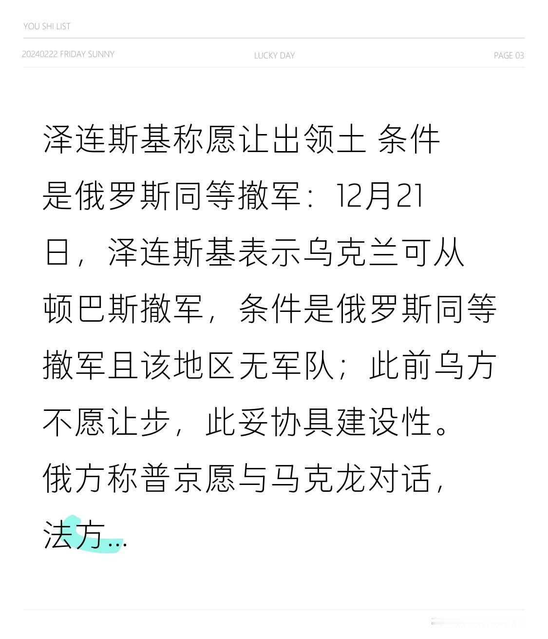泽连斯基称愿让出领土 条件是俄罗斯同等撤军:12月21日,泽连斯基表示乌克兰可从顿巴斯撤军,条件是俄罗斯同等撤军且该地区无军队;此前乌方不愿让步,此妥协具建设性。俄方称普京愿与马克龙对话,法方欢迎,或商讨欧洲安全架构问题。