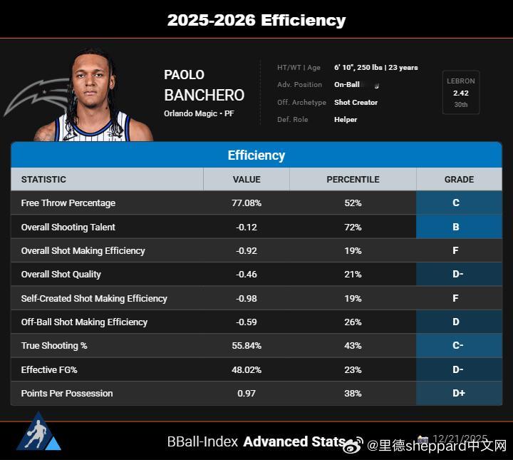 🏀 NBA 晨报 第 64 期|2025 年 12 月 23 日 · 周二灰熊3J,尼克斯布伦森当选周最佳球员主线:火箭又“守不住大领先”,加时被底角三分绝杀;选秀端肯塔基内线怪兽复出就直接进入Top6 一、🚀 火箭动态(Rockets News)1)火箭 124-125(OT)惜败国王:第四节再断电,加时读秒被“底角一枪”带走火箭在萨克拉门托又演了一遍熟悉的剧本:第四节领先两位数却没收住,比赛被拖进加时,最终被前火箭后卫 施罗德左底角三分绝杀。最后 2 秒怎么丢的?乌杜卡最后防守布置很明确:预判德罗赞强解,摆小阵容打一对一锁人。但关键回合的执行却崩了——德罗赞突破吸引协防后分到角落,伊森离开底角补防内线,施罗德接球就是全场最“干净”的一个三分空位,直接绝杀。乌杜卡赛后点名:“两分球局面,外线必须锁死,不能漏人。”伊森也主动扛责:“我们本该赢……我如果留在三分线外,他们赢不了。”2)崩盘原因:不是“加时不会打”,而是“领先后没把比赛掐死”乌杜卡视角:问题在加时之前。领先阶段没持续施压、细节松动,让对手一直有喘息空间。杜兰特视角:对手下半场开始夹击、提速、施压,火箭进攻回合质量下降、出手没转化,把对面“赌你投不进”的胆子越喂越大。3)关键数据警报:火箭输球越来越“关键时刻化”来自社媒统计:火箭本季已经输了 9 场,其中 8 场发生在关键时刻(clutch time);同时加时战绩来到 1-4。一句话翻译:火箭不是打不出优势,是优势兑现率太低。杜兰特赛后说:“当我们领先 14 分,就得把脚踩在油门上。不能慢慢走、进攻端不干事、防守端也不干事。领先 14 分时,我们得打出统治力。”5)复出亮点与隐患:伊森能量拉满,但关键回合纪律要补课伊森复出首战时间受控,但冲击力立刻拉满;问题也同样直白:火箭这波客场已经多次出现 “大比分领先 → 被追 → 加时翻车” 的循环。下一场去洛杉矶打快船,真正的考题就一句:领先时能不能继续掐死比赛,而不是等对手自己犯错。5)全明星相关:火箭“双人组”呼声起来了社媒观点汇总:KD被认为几乎稳进全明星;如果入选,他的全明星次数将来到 16 次,有望升至历史第 4(落后于詹姆斯、贾巴尔、科比)。申京同样被视为强热门:若再入选,将有机会成为火箭队史“最年轻的多次全明星之一”(与奥拉朱旺、姚明等名字并列)。4)全明星“锁定”球员:Kalshi 给出 90%+ 名单来自 Kalshi 的“全明星锁(90%+)”名单(偏市场预测/概率盘口概念),包括:SGA、东契奇、约基奇、KD、爱德华兹、杰伦·布朗、斯科蒂·巴恩斯、布伦森、杰伦·约翰逊、米切尔、切特、库里、康宁汉姆、文班亚马、申京、马克西等。注:这是“市场/平台预测”意义上的概率,并非官方票数或联盟公告,可作为风向参考。二、🌍 联盟动态(League News)灰熊3J,尼克斯布伦森当选周最佳球员1)骑士后场暗流:加兰想“重新带自己的队”?Legion Hoops 引述消息称:一些球队得到的情报是,加兰未来某个时间点希望再次拥有“自己掌控的球队”,而不是长期扮演米切尔身边更偏“互补型”的角色。(这类话题通常意味着:联盟在观察骑士后场长期结构是否会变化。)2)奇才态度明确:暂时不考虑交易卡姆·惠特莫尔社媒转述称:有联盟消息源表示,华盛顿目前不打算交易/送走惠特莫尔。管理层在从火箭得到他时就很清楚:天赋在线,但需要耐心培养、需要环境“养成”。3)收视数据:NBA 本季美国观众累计超 8700 万,上涨 89%记者 Ian Begley 转述联盟口径:NBA 本季在 NBC/Peacock、ESPN、Amazon Prime Video、NBA TV 等平台的美国观众累计超过 8700 万,创 15 年最高,并较上季提升 89%。同时他也抛出一个关键疑问:流媒体“观众”究竟如何统计与口径化——这点未来大概率会成为讨论焦点。4)效率警报:班切罗本季“产量有、效率掉队”BBall Index 的一张图(图2)直接点题:班切罗本季得分转化率不理想,整体投篮效率相关指标多项处在偏低分位。他还是能持球创造、能要球、能出手,但把球放进篮筐的“质量”明显跟不上“球权”;这会直接影响魔术关键时刻的进攻形态:当你主攻点效率不高,就更容易被对手用夹击和收缩逼你“硬解”。三、🧑🎓 选秀观察(2026 Draft Watch)1)Mock Draft 2.0(1-6)速览:主旋律只有一句——BPA 优先,先把天赋收进口袋这一集最统一的价值观是:别急着补洞,先拿最强的人。尤其是像国王、雷霆这种阵容结构复杂的队,选秀更像“长期资产配置”,不是给明天就上岗的螺丝钉找岗位。① 篮网(状元):Darryn Peterson(堪萨斯,后卫)更像 2 号位/Off-ball guard:三层得分、造犯规、自主解决进攻,防守端也有压迫感。争议腿筋伤,但观点是“烦人不致命”。② 奇才(榜眼):Cam Boozer(锋线)给 Sarr 身边再堆前场火力:强硬、终结、赢球履历足。质疑关键时刻存在感,但主持人认为单场不该盖棺定论。③ 老鹰(探花):AJ Dybantsa(侧翼)天赋太大,不选说不过去:爆点式创造 + 侧翼长度 + 运动能力 + 对抗想象。放特雷身边就是“你发动,我撕裂空间”。④ 国王(第 4):Caleb Wilson(锋线)不补控卫,直接 BPA。标签“文化改造者”:狠、冲、能量拉满,防守端上限吓人。⑤ 步行者(第 5):Jayden Quaintance(肯塔基,中锋)JQ 复出后热度回归:运动能力 + 对抗 + 篮板 + 防守多样性。放哈利伯顿身边就是挡拆顺下、空接吃饼、二次进攻的豪华套餐。⑥ 雷霆(第 6):Mookie Brown Jr.(后卫)雷霆式哲学:后卫多?照选。新 CBA 下“人才流水线/农场系统”更重