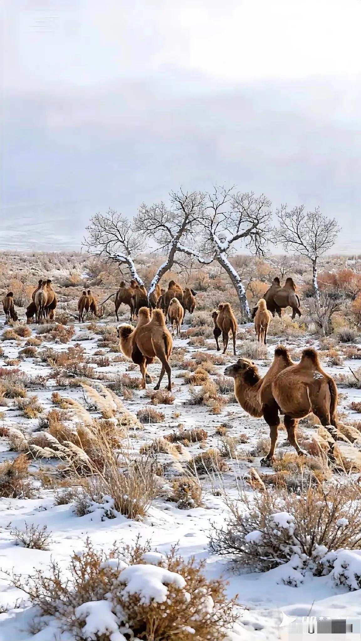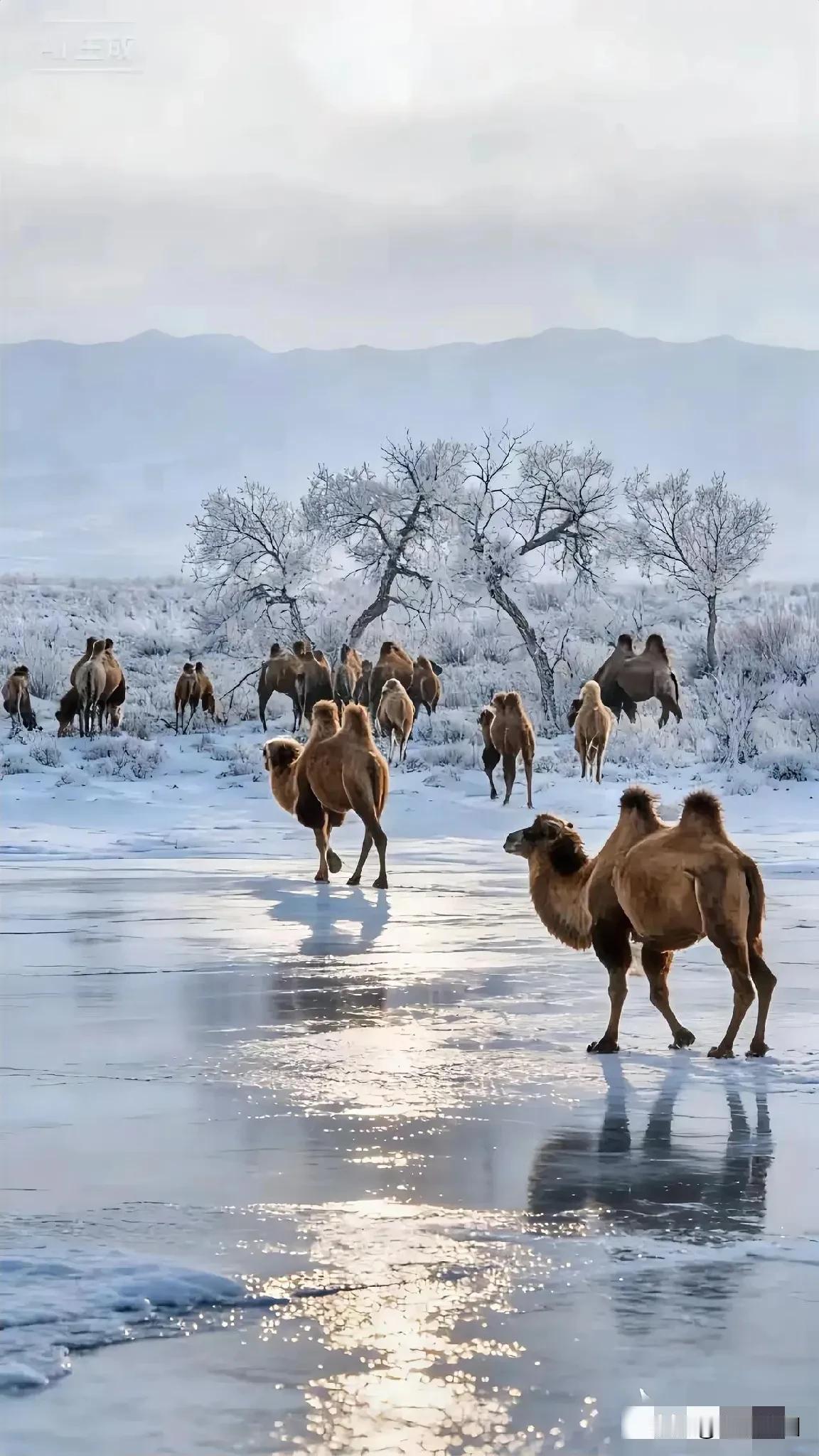 冬日暖阳下,两只小鸟在雪枝上欢唱,静谧的河面倒映着它们的影子。