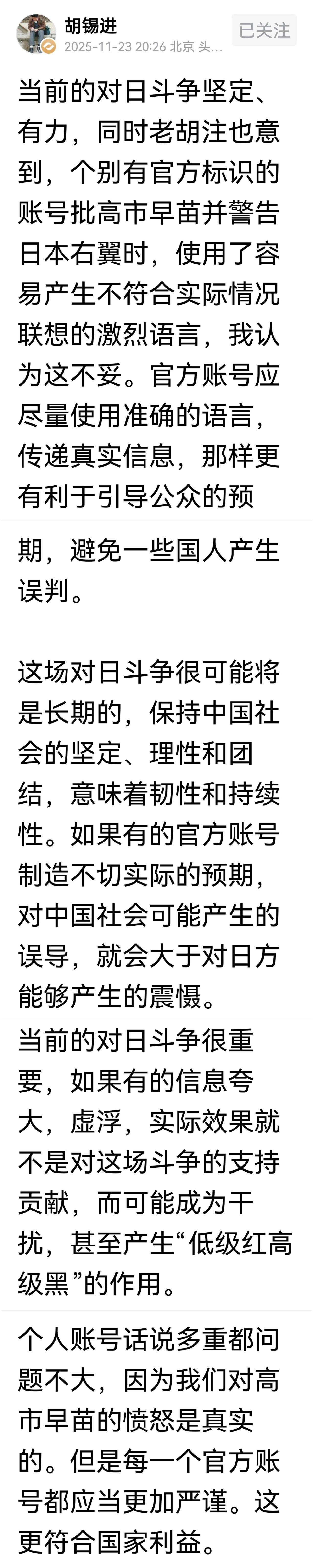 重读胡锡进一个月前写的一篇文章,很担心老胡说的话被应验。 老胡的主要观点是: “个别有官方标识的账号批高市早苗并警告日本右翼时,使用了容易产生不符合实际情况联想的激烈语言,我认为这不妥……如果有的官方账号制造不切实际的预期,对中国社会可能产生的误导,就会大于对日方能够产生的震慑……如果有的信息夸大,虚浮,实际效果就不是对这场斗争的支持贡献,而可能成为干扰,甚至产生一‘低级红高级黑’的作用。” 当时对老胡的这个观点和很多网民一样,也是嗤之以鼻,认为这是在全国军民同仇敌忾、热情高涨时泼冷水、拔气门芯。 但一个月过去了,五大战区、军报、央媒,国防、外交、国台办等官方账号用一反常规的“非官方语言”宣示后,日本反而加紧备战、在国际社会上蹿下跳、再闯钓鱼岛,更为嚣张;美国对台宣布史上最高额军售,赖清德之流台独分子更加猖狂;越南军舰通过台湾海峡,菲律宾持刀渔民继续闯礁。似乎震慑效果确实与老百姓的预期有较大落差,而网上也开始有“低级红高级黑”的声音。 所以很担心老胡的预言正在被应验。 位卑未敢忘忧国,笔者别无他意,只是作为“一介匹夫”把个人的忧虑说出来,哪怕文章审核不通过或限流。