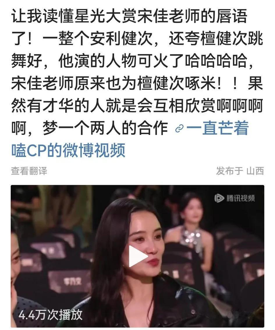 有没有人发现 檀健次上台宋佳和宋祖儿的表情亮了,可以说截然不同。 通过唇语也
