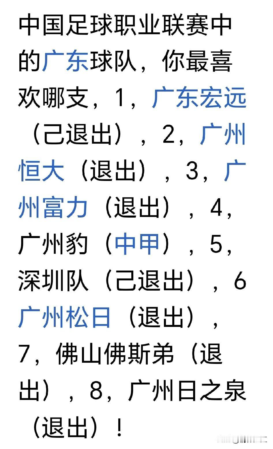 看到这些名称,这是广东球迷非常熟悉的足球俱乐部球队。可惜的是,它们都成为历史的记忆!它们曾经承担着广东省足球的辉煌历史,带给广东球迷很多美好的回忆,也给广东足球赢得了荣誉和尊重,甚至是羡慕。目前,除了还在中甲征战的新兵广州豹,其它球队都退出中国足坛,甚至解散了。非常可惜啊!堂堂中国经济第一大省,足球却由盛而衰,很令人困惑。虽然说广东省的职业足球遵循市场经济运作,俱乐部的经营优胜劣汰是符合经济规律,但是也离不开政府和社会的支持。希望以后广东省足球运动重新崛起,打造可持续发展的足球俱乐部,甚至是百年足球俱乐部。