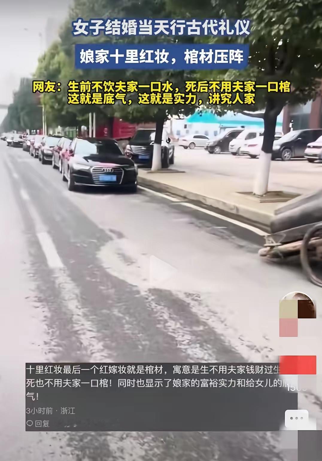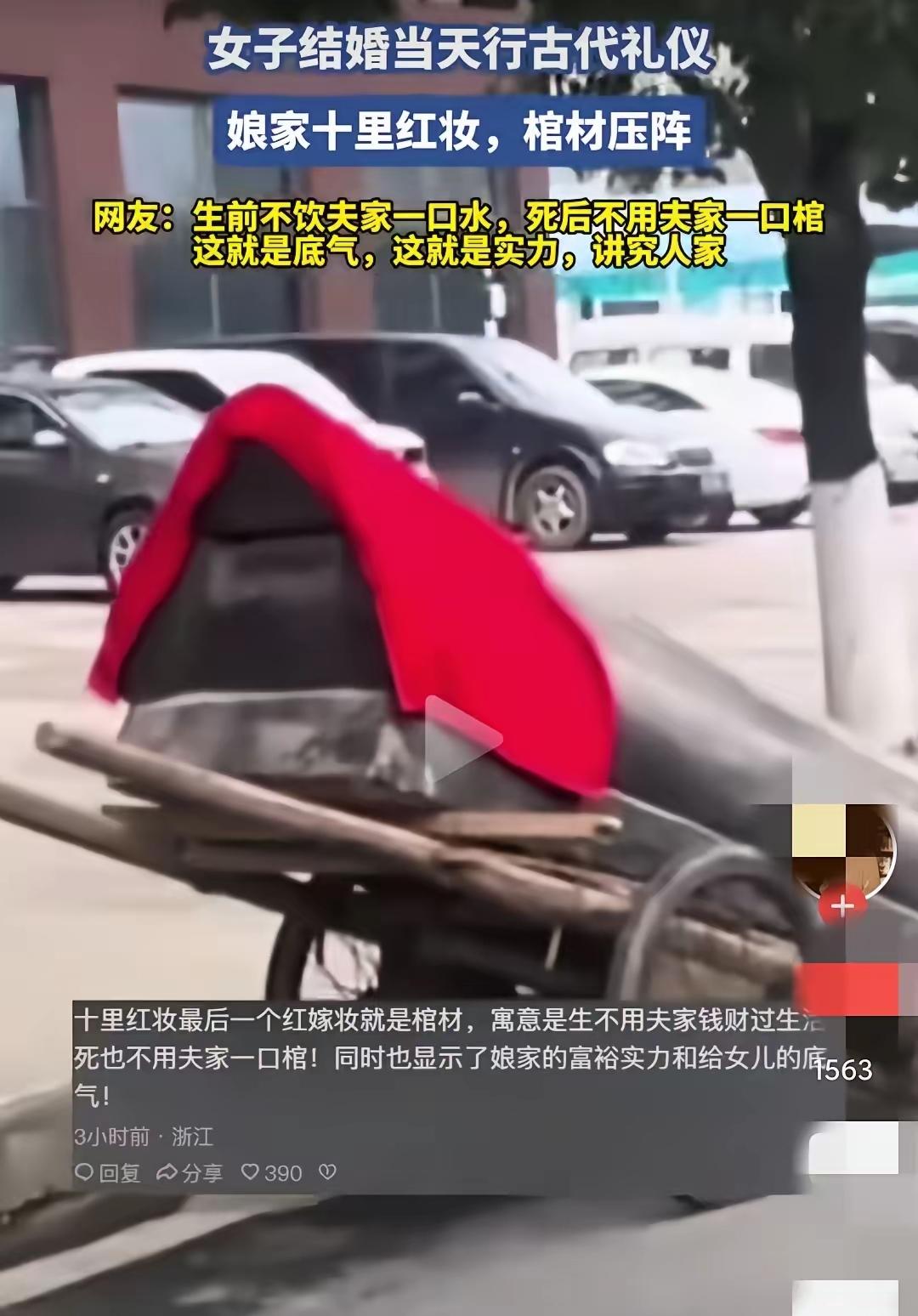这个婚礼直接看愣了。 女子采用古代婚仪,十里红妆,棺材压阵。 刷到这个视频的时候我直接愣住了,活了几十年头回见婚礼上抬棺材的,弹幕里全是“吓一跳”“这操作太硬核”。有网友说这是娘家的底气——生不靠夫家,死不求夫家,一口棺材直接把后路摆明了,比陪嫁豪车洋房还戳人。 其实娘家想给女儿撑腰的心思能理解,但用棺材当“底气道具”真的没必要。婚姻不是博弈,与其用这种让人心里犯嘀咕的方式立威,不如实实在在教女儿经营生活的能力。 你们觉得呢?婚礼上用棺材彰显底气,是真硬核还是用力过猛?婚礼抢镜名场面