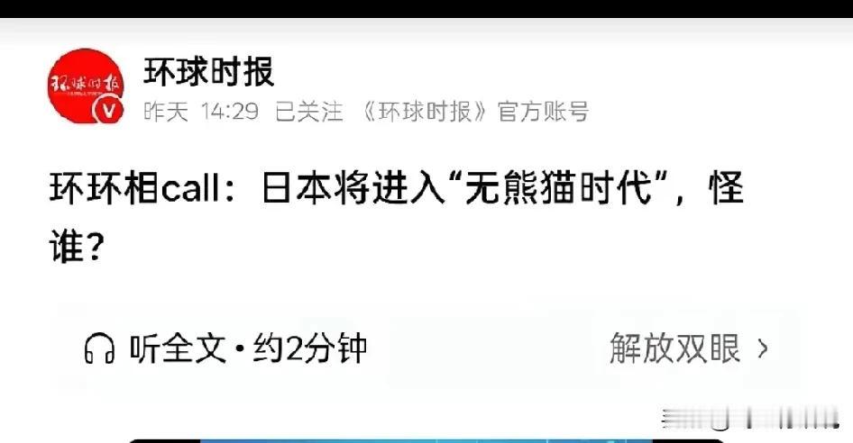 看看《环球时报》这语气 ,似乎没有熊猫了,日本人就吃不饱饭了,睡不着觉了 有没有熊猫,对日本人的影响真不大 影响大的是双方来往减少,经贸减小 而拿熊猫说事,就显得《环球时报》太小家子气了
