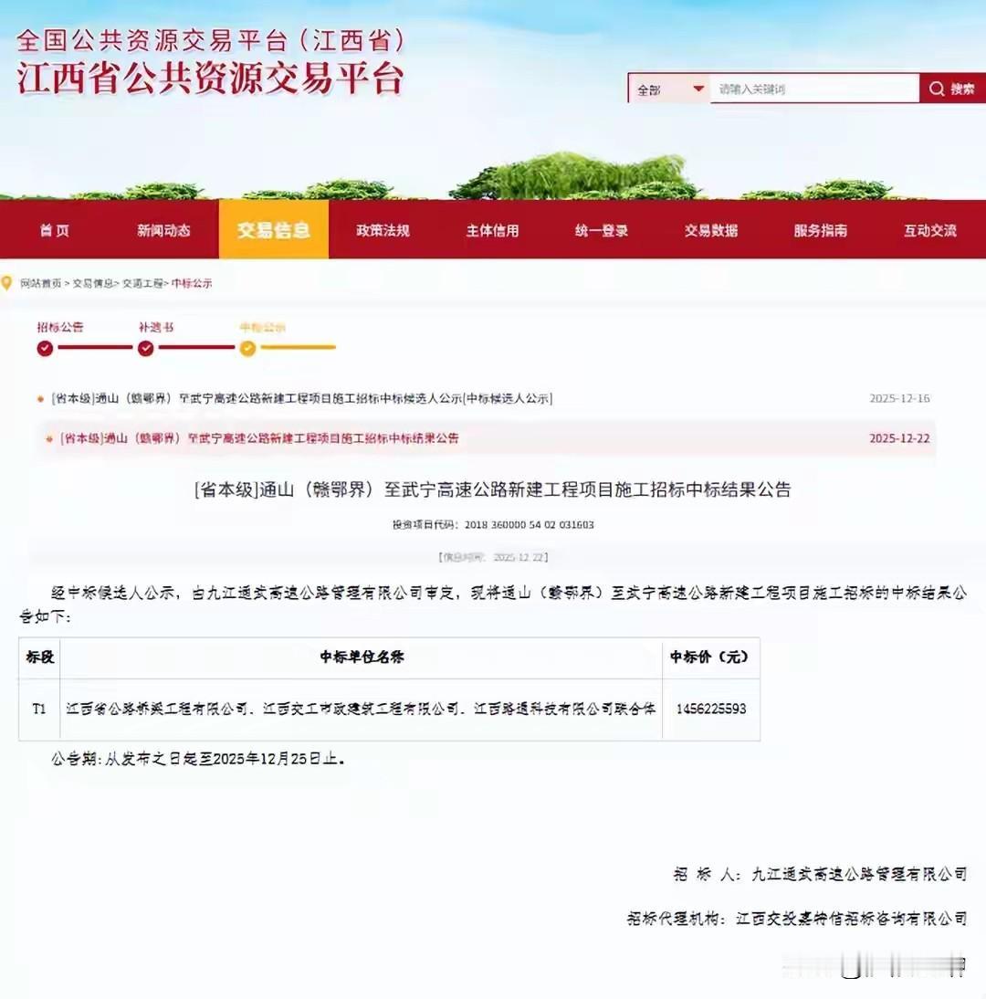 好消息!停工多年的通武高速江西段,终于迎来新进展。施工招标结果公告重磅发布,该项目将于2026年开工,2027年建成通车并投入运营。 近日,通山(赣鄂界)至武宁高速公路新建工程项目施工招标中标结果公告揭晓。 中标人是由江西省公路桥梁工程有限公司、江西交工市政建筑工程有限公司、江西路通科技有限公司组成的联合体。中标价格高达1456225593元。