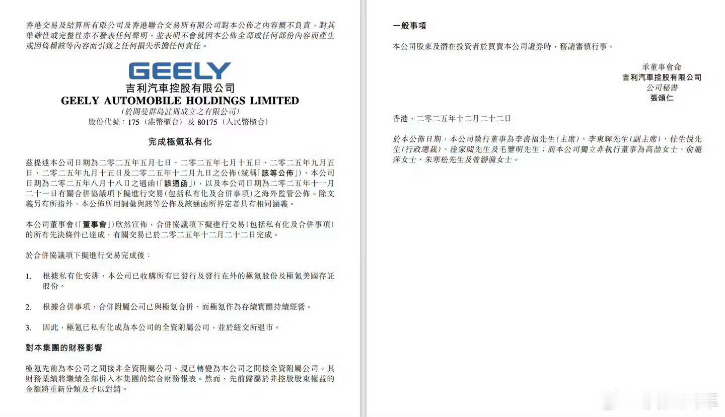【吉利汽车完成对极氪收购极氪正式从美股退市】12月22日晚间,吉利汽车控股有限公