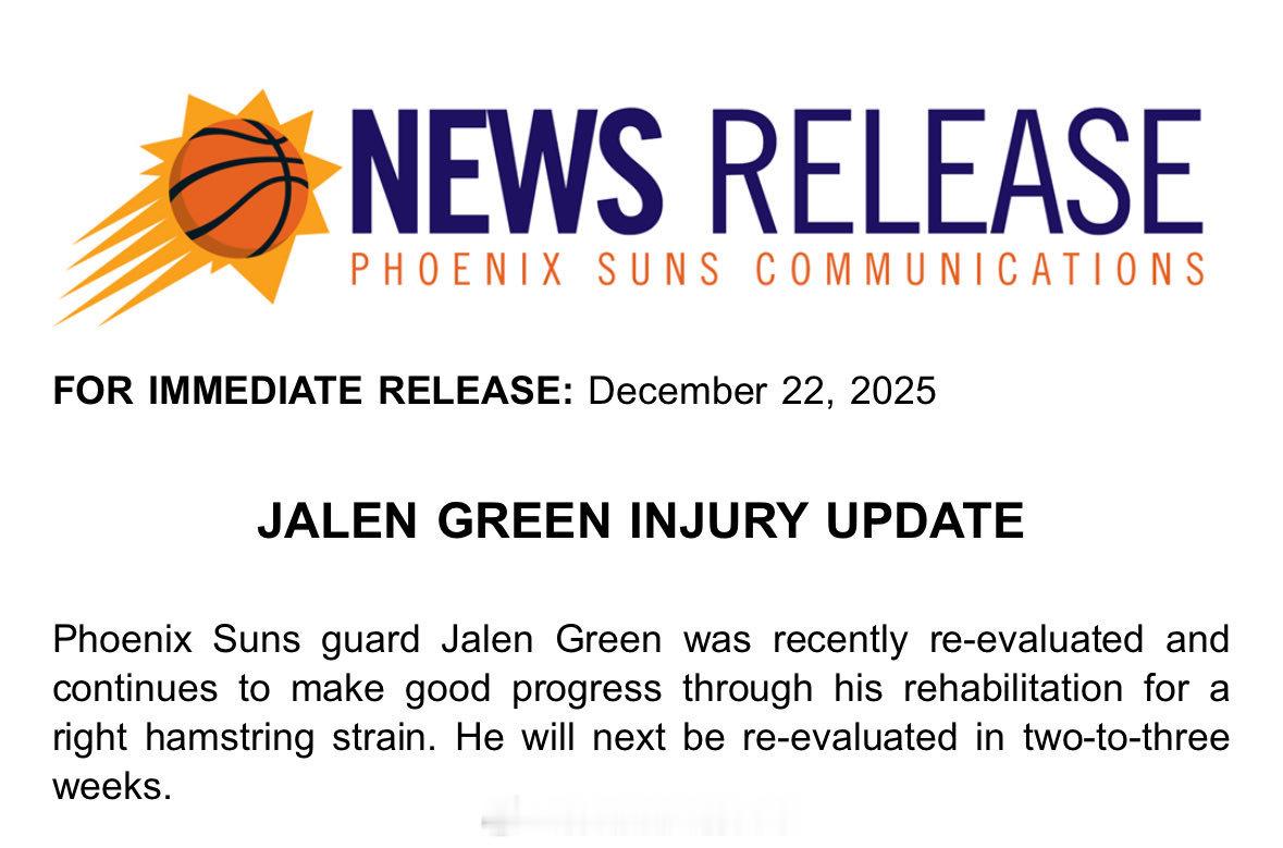太阳官方表示,杰伦-格林近期接受了复查,腿筋伤势在持续恢复之中,将在2-3周后重新复查。火箭队将于1月6日在丰田中心主场迎战太阳。这意味着,我们恐怕要等到下赛季才能在丰田中心看到他上场比赛了。休斯顿火箭新赛季篮不住篮球年末狂欢季