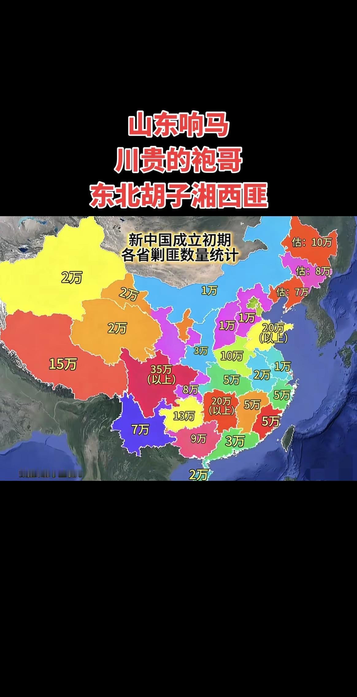 新中国初期各省剿匪数量统计。中国哪里的土匪最多?川渝袍哥山东响马湘西剿匪最出名,双枪老太婆也是真实剿匪 地理