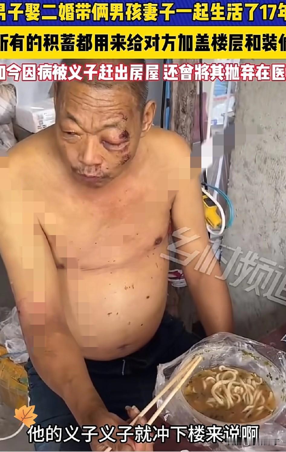 浙江义乌,一男子59岁,17年前娶了一名二婚女子,当时女子还带有两个孩子,一个10岁,一个14岁。 17年掏心掏肺养继子,卖老宅、拿棺材本,把俩孩子从懵懂少年捧到成家立业,自己病倒后,继子连3000元医药费都不肯出,还拿“没结婚证”当挡箭牌,直言他就是外人! 这哪是养孩子,简直是喂了白眼狼!17年的血汗恩情,难道抵不过一张纸?别拿法律当冷血的借口,就算没有婚姻关系,17年的养育付出,也是刻在骨子里的情分! 继子的做法,不光凉了王先生的心血,更是丢了做人的基本底线! 幸好外甥女及时出现,带舅舅脱离苦海。这事也给所有人敲了警钟:真心换真心的前提,是对方得有良心! 付出时别太傻,必要的法律保障不能少,不然一腔热血,最后可能只换来刺骨寒心!