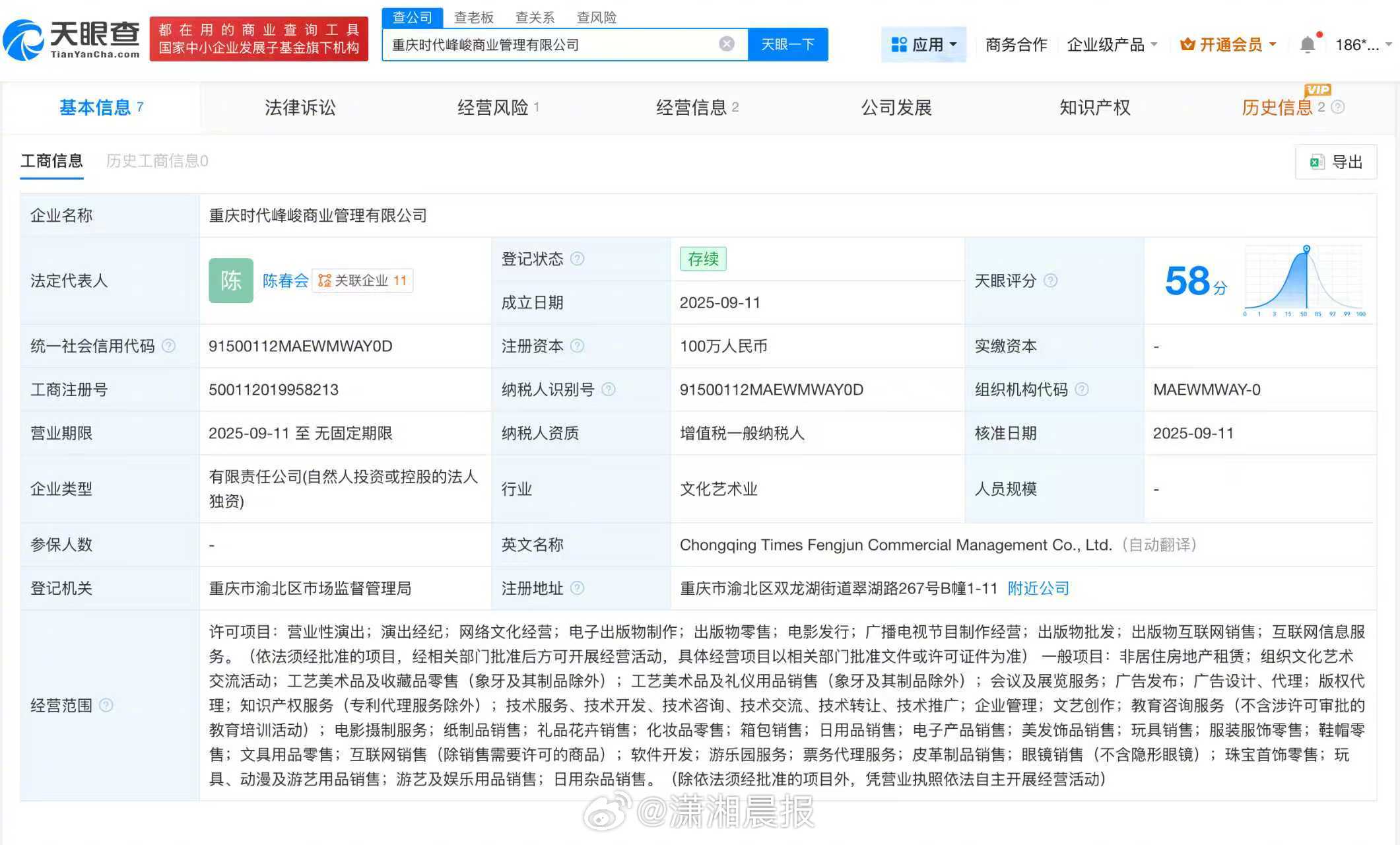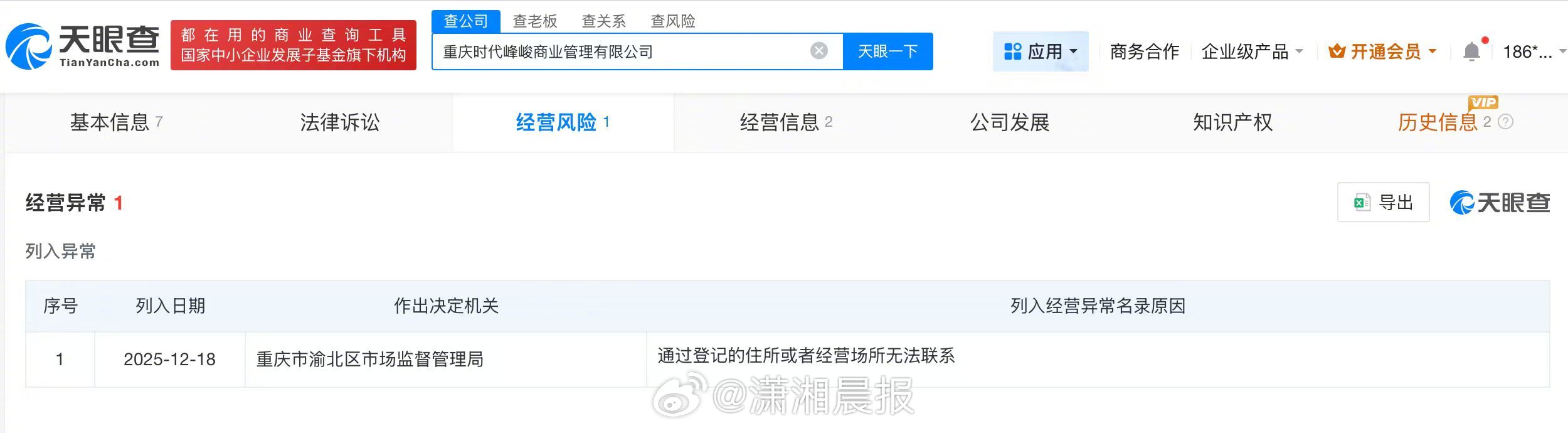 【#时代峰峻一公司经营异常#】#时代峰峻重庆新公司经营异常#12月23日,记者查询天眼查经营风险信息显示,近日,重庆时代峰峻商业管理有限公司因通过登记的住所或者经营场所无法联系,被重庆市渝北区市场监督管理局列入经营异常名录。该公司成立于2025年9月,法定代表人为陈春会,注册资本100万人民币,经营范围包括营业性演出、演出经纪、网络文化经营等,由北京时代峰峻文化艺术发展有限公司全资持股。