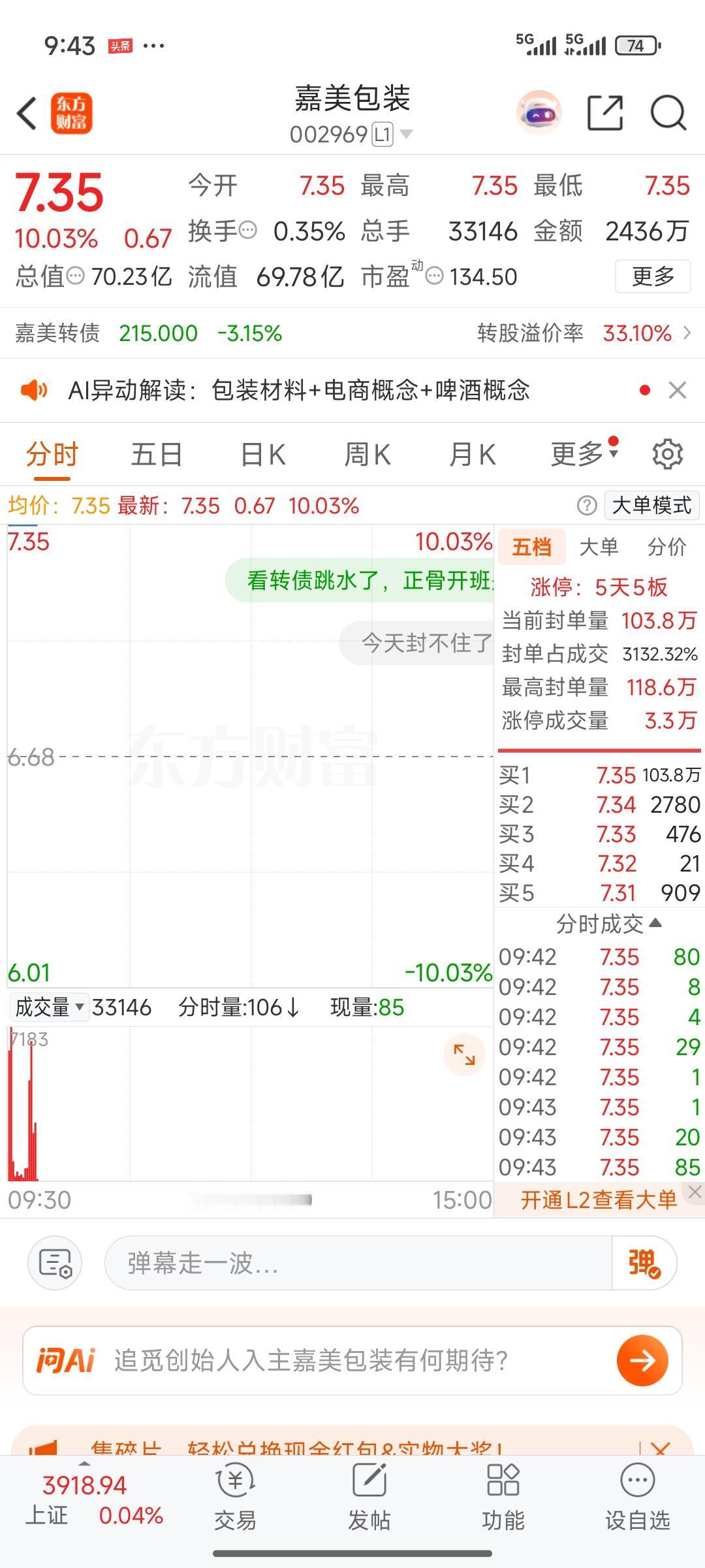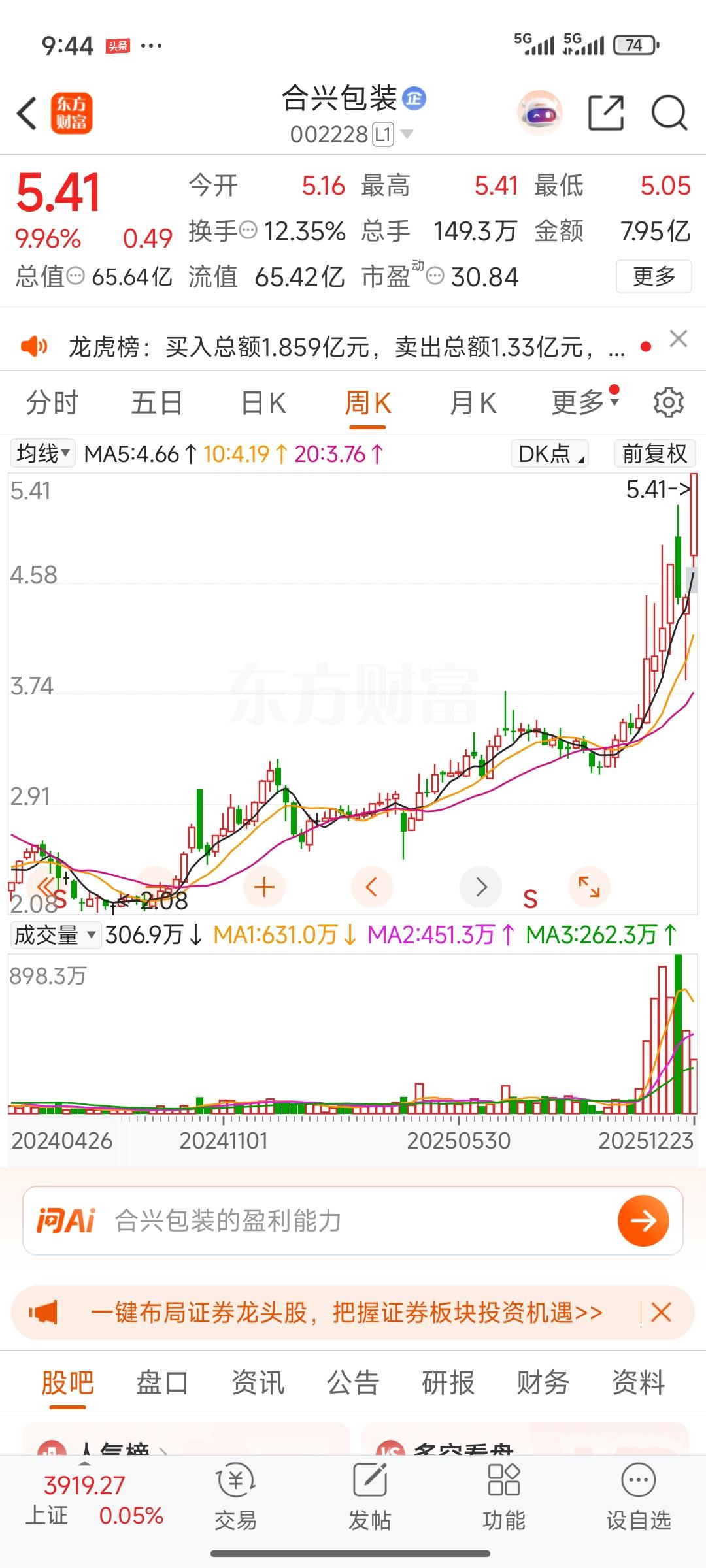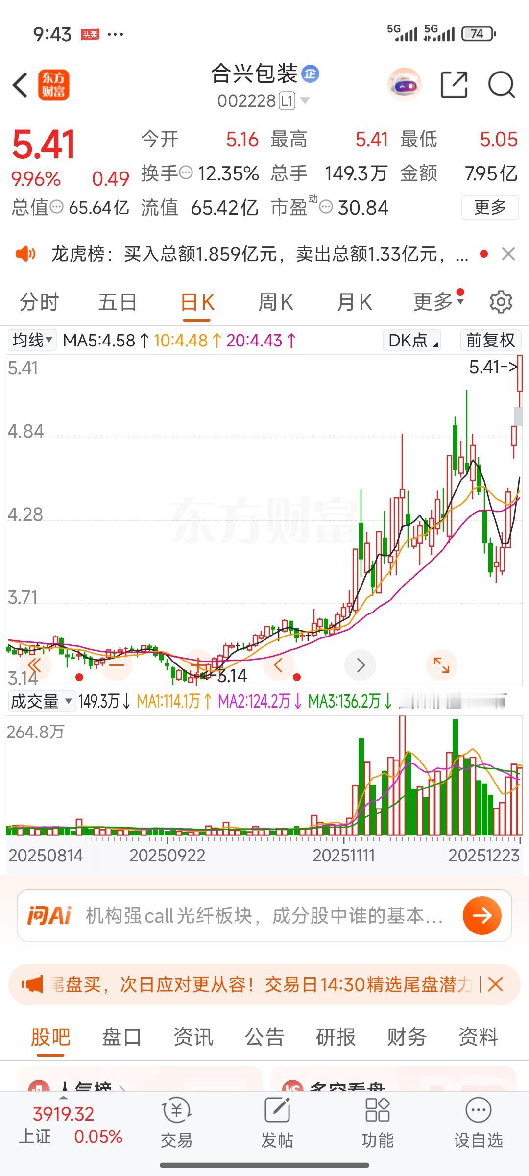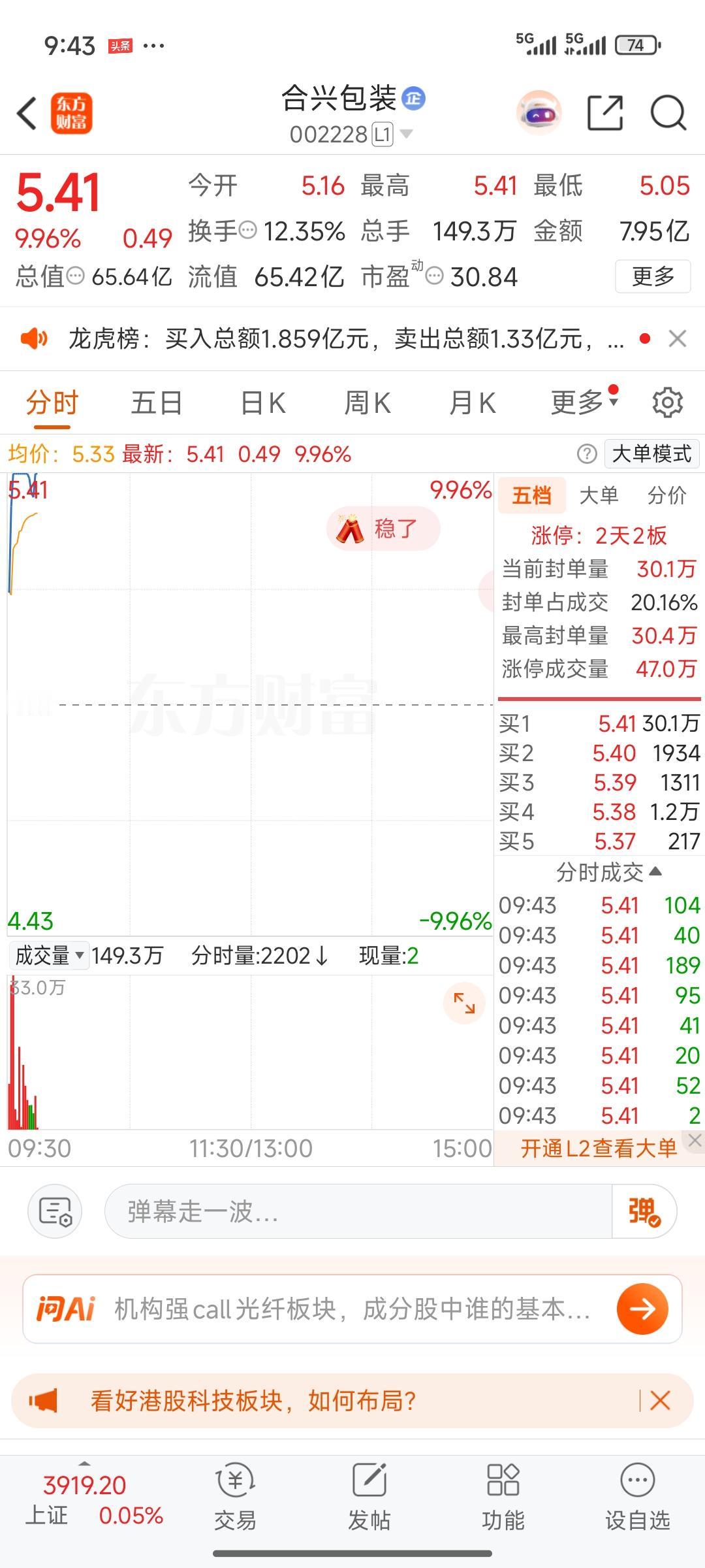 兄弟们,今天我打板合兴包装了。昨天复盘时,我发现包装板块有三只股票表现极为强势,便对它们予以密切关注。今日,嘉美包装依旧一字封涨停,合兴包装也符合强势高开的特征。在它封涨停的瞬间,我追高买入。今日该股放量分歧,也不知明天和后天能不能让咱们吃点肉、喝点汤,兄弟们。 打板