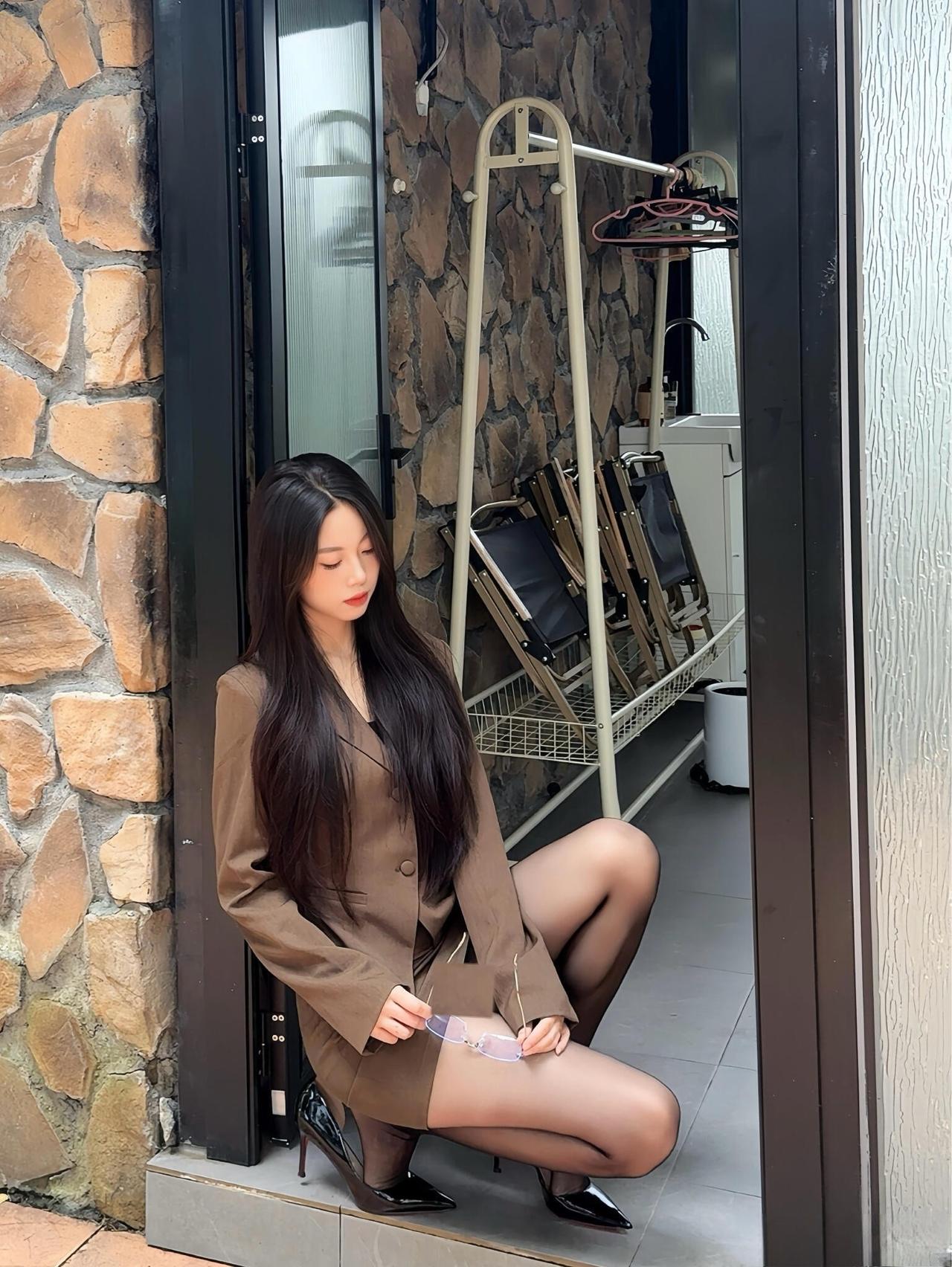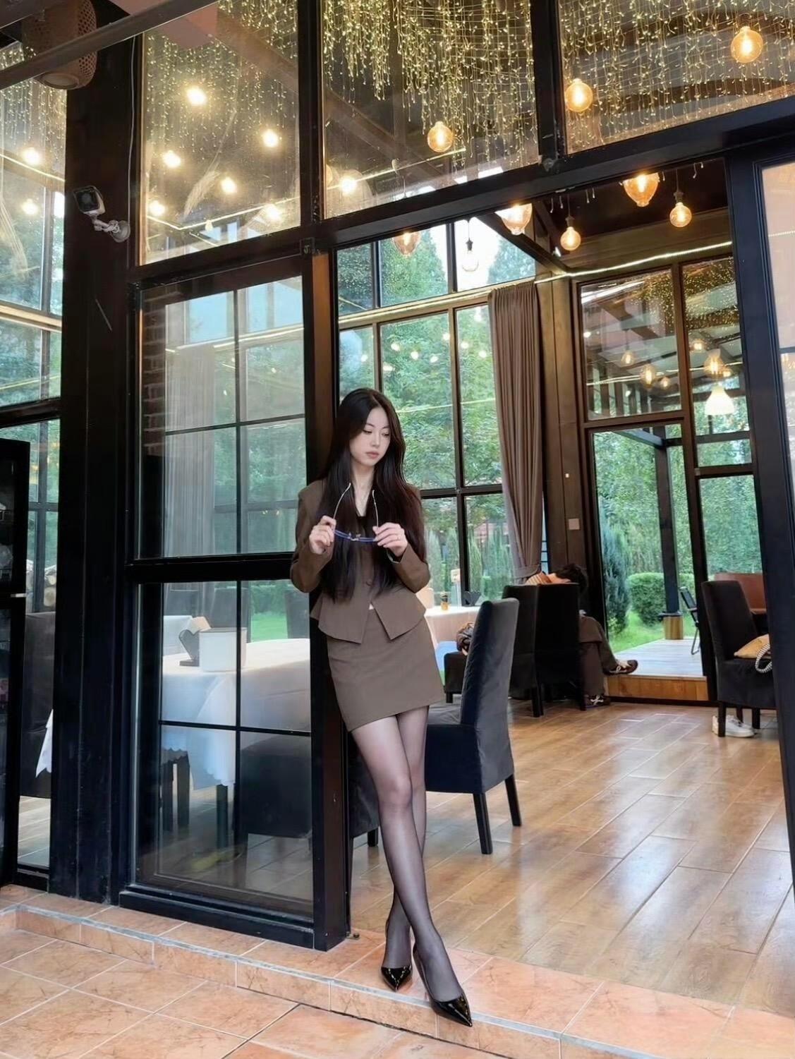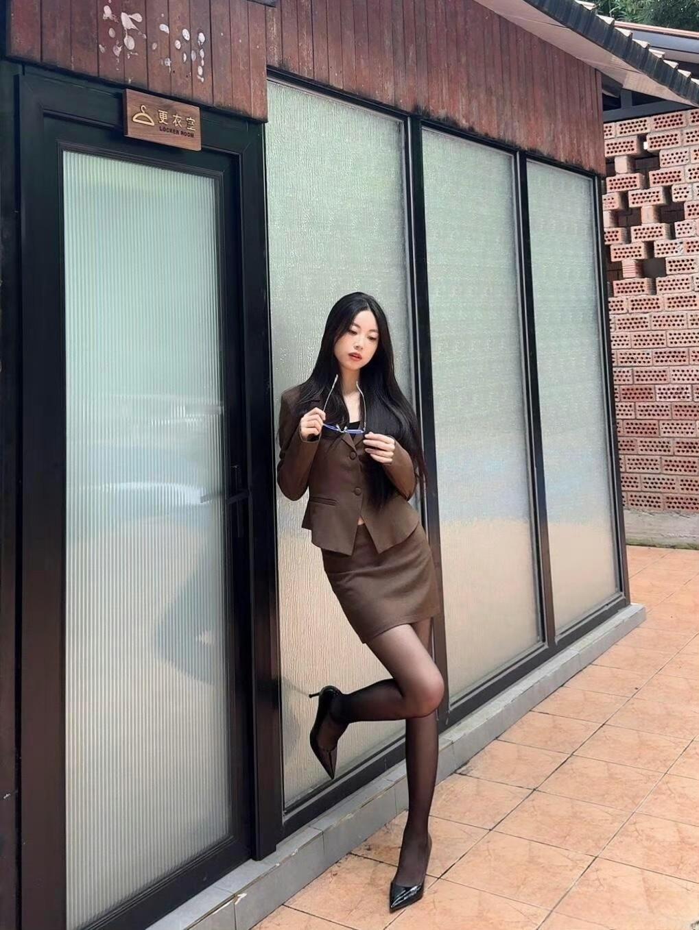 这套穿搭是干练轻熟的棕系职场甜酷风,棕褐色短款西装+同色系包臀裙的套装自带职场干练感,短款版型显高又利落;内搭隐约露出的线条增添了轻熟性感,适配轻职场或轻奢休闲场合。 搭配尖头高跟鞋精致利落,与西装的气场呼应,提升了整体精致度;眼镜配饰注入一丝清冷感,让甜酷风格更有层次。能充分展现穿着者干练轻熟的甜酷魅力。棕色西服穿搭 咖棕色半裙套装 通勤穿搭
