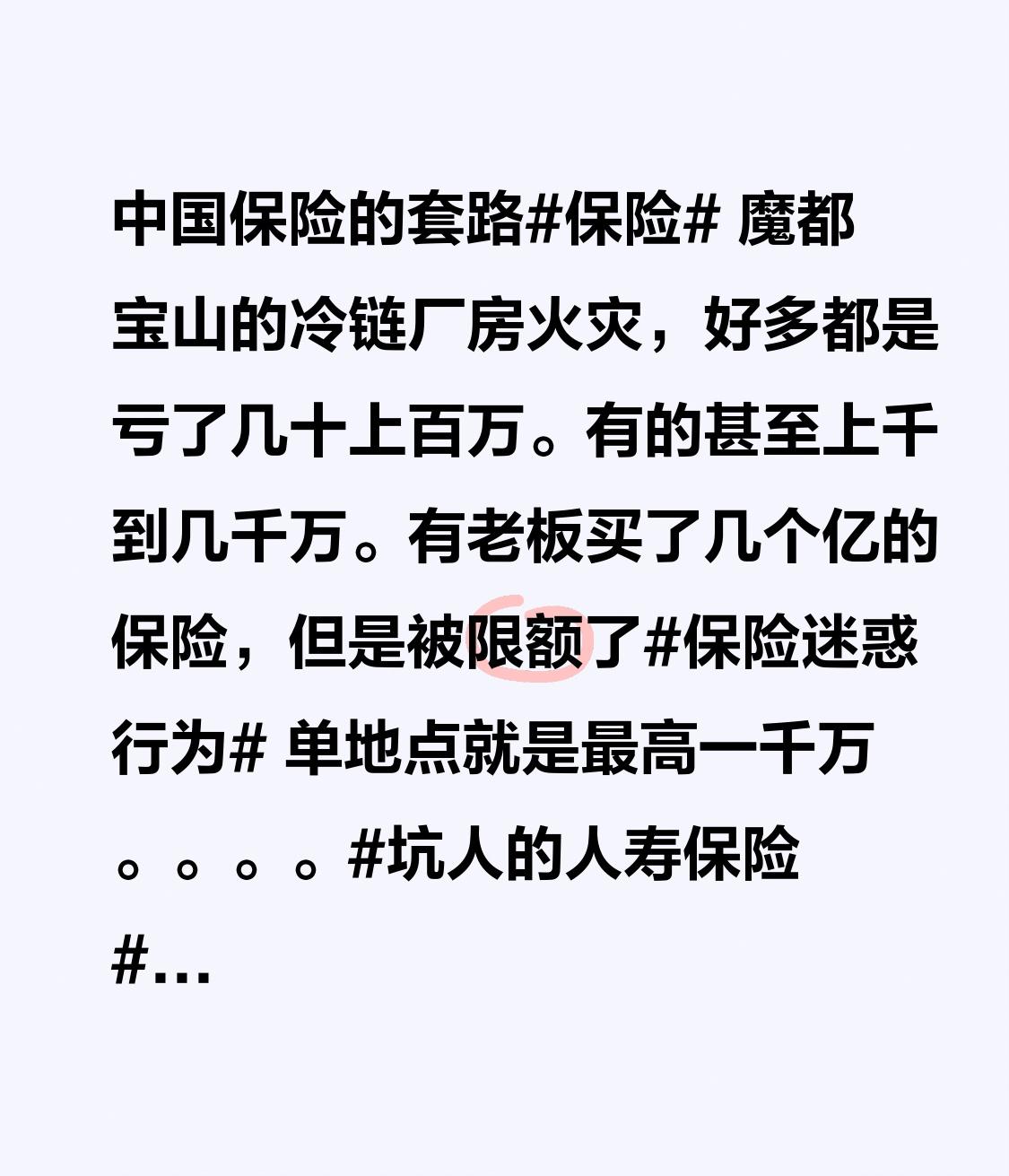 中国保险的套路保险 魔都宝山的冷链厂房火灾, 好多都是亏了几十上百万。 有的甚至上千到几千万。 有老板买了几个亿的保险, 但是被限额了保险迷惑行为 单地点就是最高一千万。。。。坑人的人寿保险 你买了一个亿也最多赔一千万