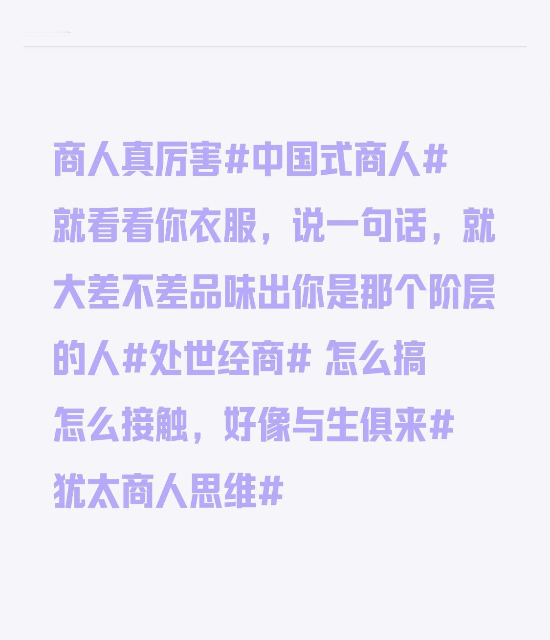商人真厉害中国式商人 就看看你衣服, 说一句话, 就大差不差品味出你是那个阶层的人处世经商 怎么搞怎么接触, 好像与生俱来[赞][灵光一闪]犹太商人思维 亏了就要跑路, 怎么钻营搞活路[灵光一闪]人性经商思维 与生俱来还是人性本恶???