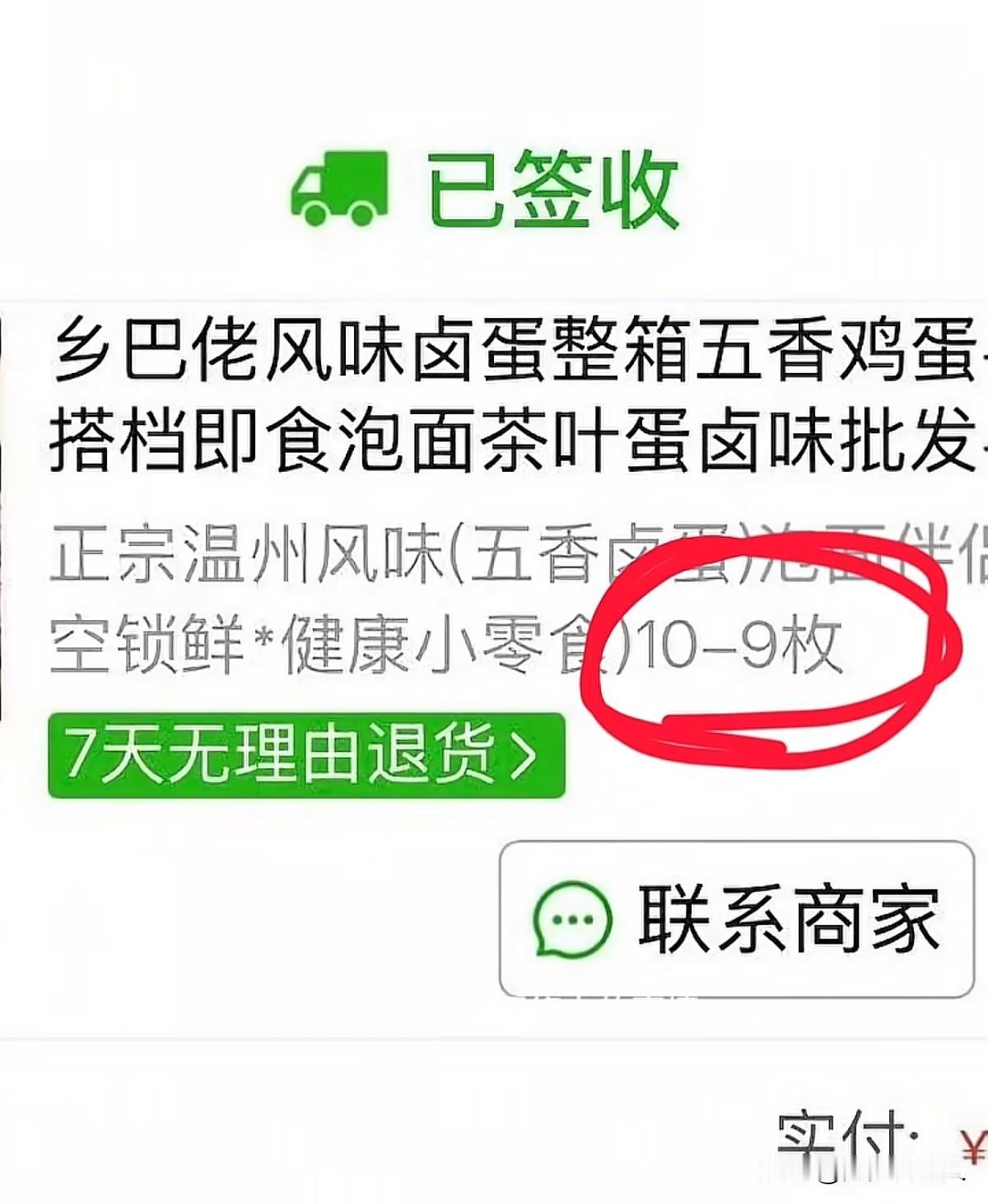 现在的电商越来越喜欢耍小聪明了!你以为捡漏了,10-9枚茶叶蛋大甩卖,赶紧下单,结果只收到一枚蛋。 于是就问商家,为什么才一枚?是不是发错了呢!商家回复你:亲这是减号,10-9=1 还好商家写的不是9-10枚,要不然下单的人,还要寄给商家一枚[what]
