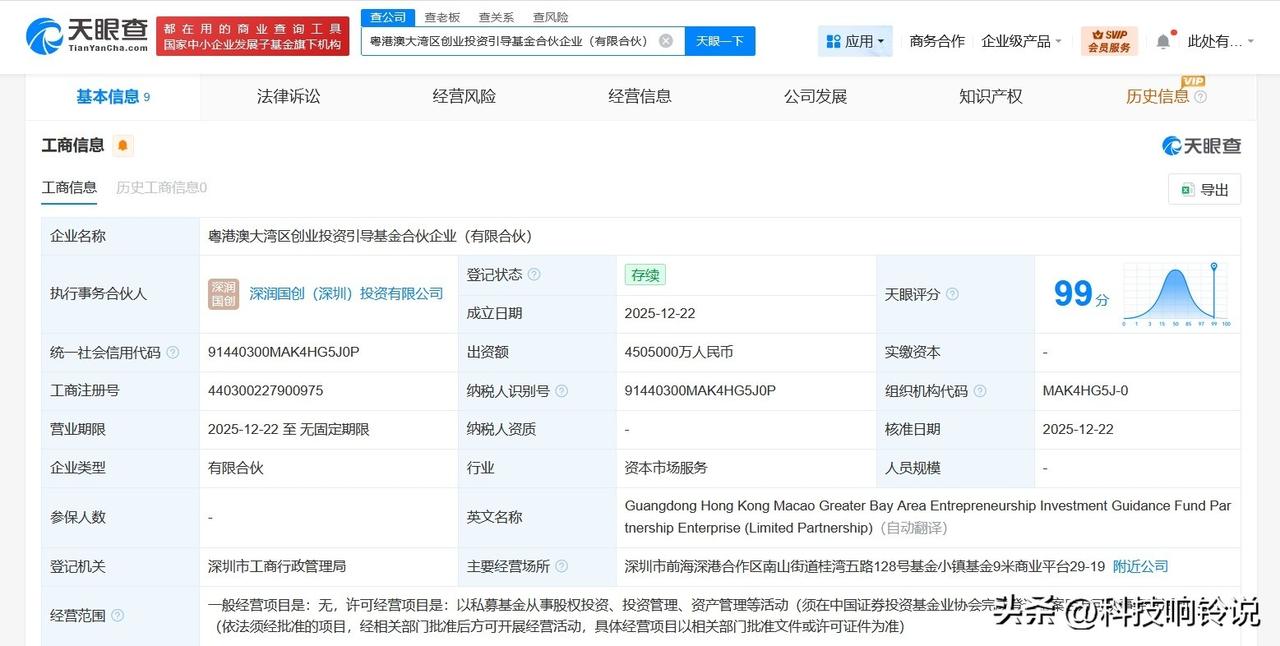 【粤港澳大湾区创业投资引导基金登记成立 出资额450.5亿】 天眼查工商信息显示,近日,粤港澳大湾区创业投资引导基金合伙企业(有限合伙)成立,执行事务合伙人为深润国创(深圳)投资有限公司,出资额450.5亿人民币,经营范围为以私募基金从事股权投资、投资管理、资产管理等活动。合伙人信息显示,该基金由国家创业投资引导基金有限公司、深圳市国创引科创投资合伙企业(有限合伙)、广东省战略性新兴产业投资引导基金有限责任公司等共同出资。 天眼查信息: