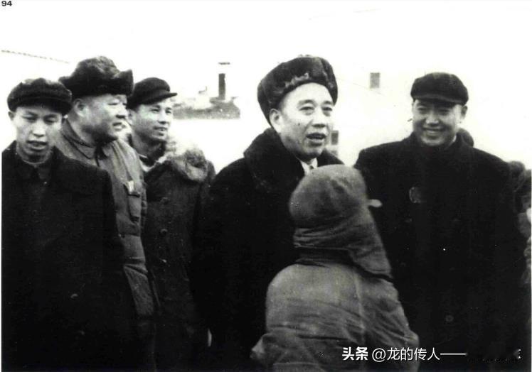 王震任命被俘的敌29军参谋长刘振世为我5师95副参谋长。刘在联络国民党部队起义方面起了很好作用,后任新疆生产建设兵团农7师师长。图为1960年王震视察农7师时与刘振世(左2)等在一起。