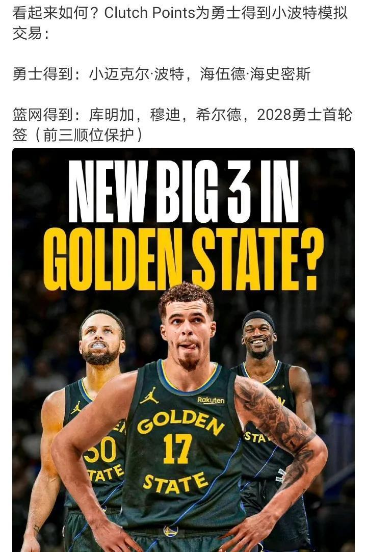 只搞个小波特也没用 这个搭首轮太不值钱了 勇士缺的是顶级防守球员 要小波特干啥,还那么贵,波特伤病那么多还没防守都愿意出首轮了,不如换鹈鹕的琼斯还不用出库明加,穆迪+希尔德配平。