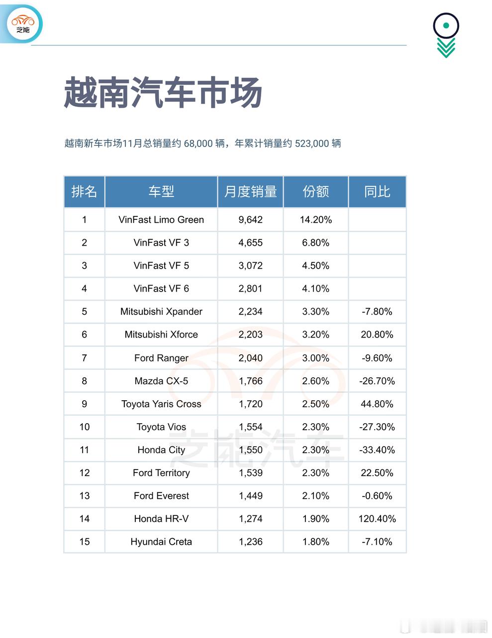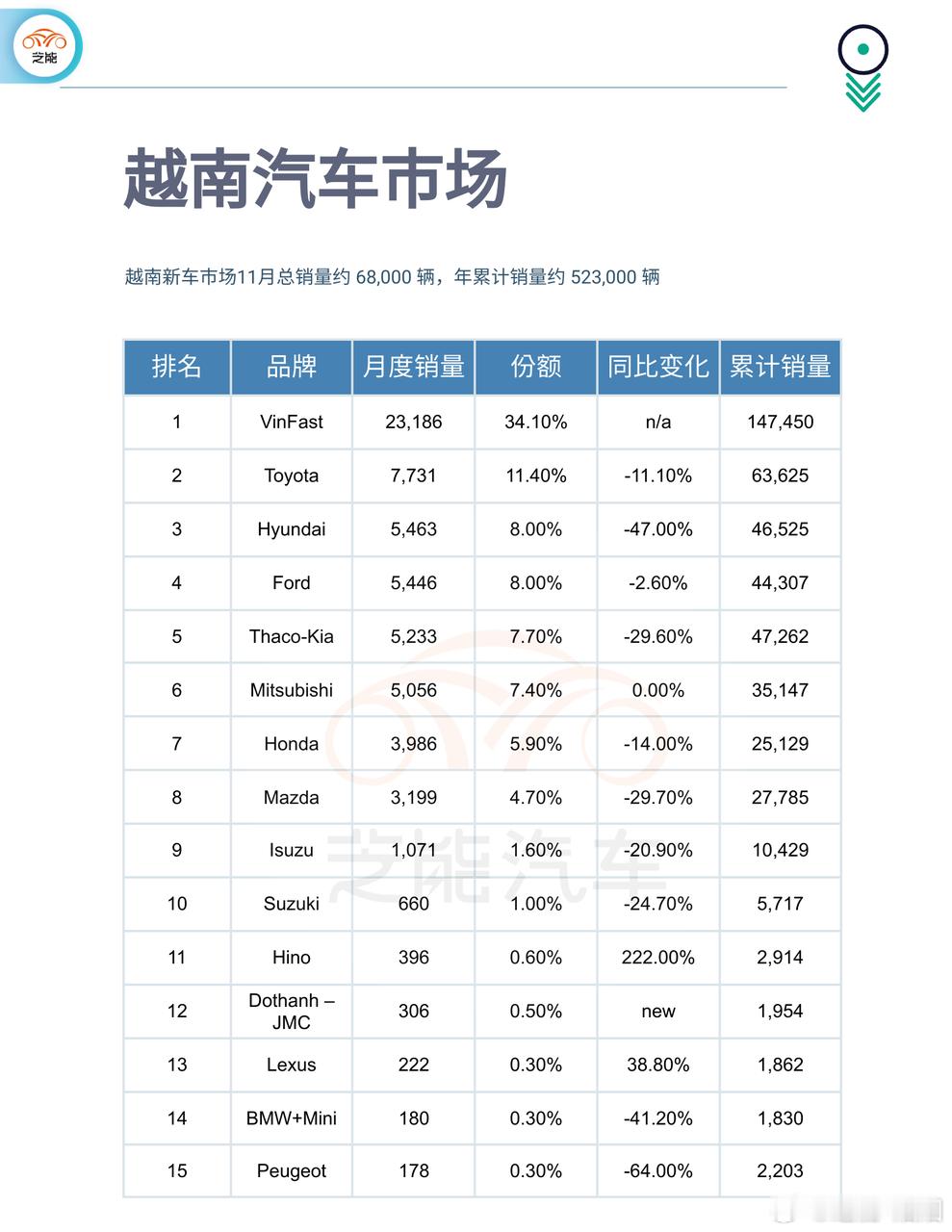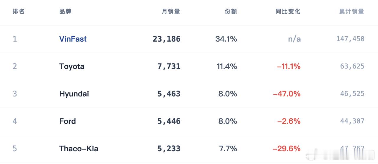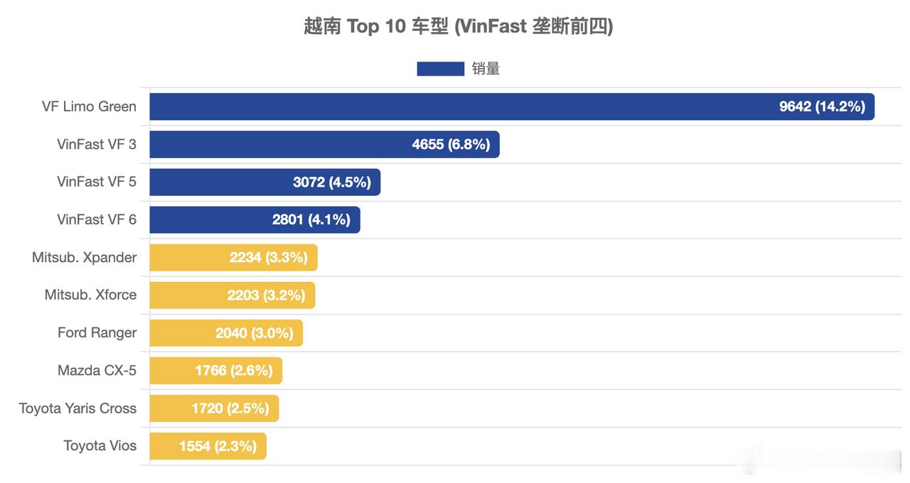 越南汽车市场基本被 VinFast 盘活了,不算它的话整体没什么增长。这里消费者超看重价格,小型 SUV、MPV 和皮卡更吃香,对本土制造、服务很敏感,新能源也不是政策强推,全靠 VinFast 硬撑起来。传统品牌里丰田守得最稳,现代受冲击最大,有的靠硬核车型稳住局面,有的份额被持续蚕食。中国品牌目前存在感还很弱,短期没太多机会,长期看市场有成长潜力~