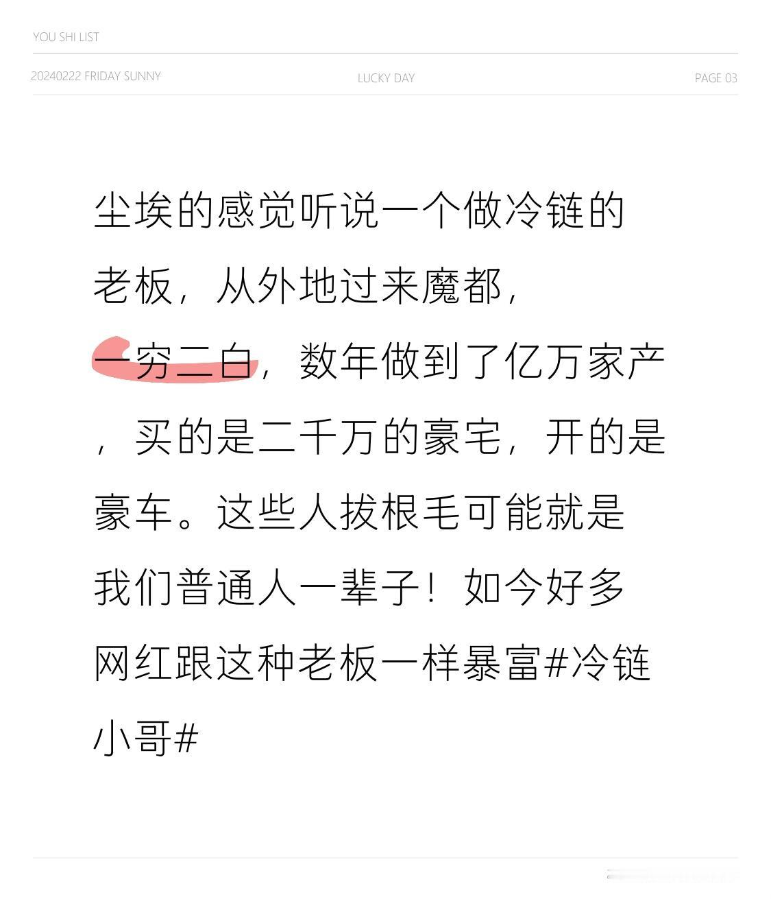 尘埃的感觉 听说一个做冷链的老板, 从外地过来魔都, 一穷二白, 数年做到了亿万家产, 买的是二千万的豪宅, 开的是豪车。 这些人拔根毛可能就是我们普通人一辈子! 如今好多网红跟这种老板一样暴富冷链小哥 这些人的视野及境界, 完全碾压我们这些卑微的尘嚣般人物[捂脸][捂脸][捂脸] 所以在外面一定要低调, 魔都这么住别墅的有钱人, 不要惹这些富人, 也不要惹那些光脚的人,认怂(本来就混的差怂[捂脸][捂脸][捂脸])
