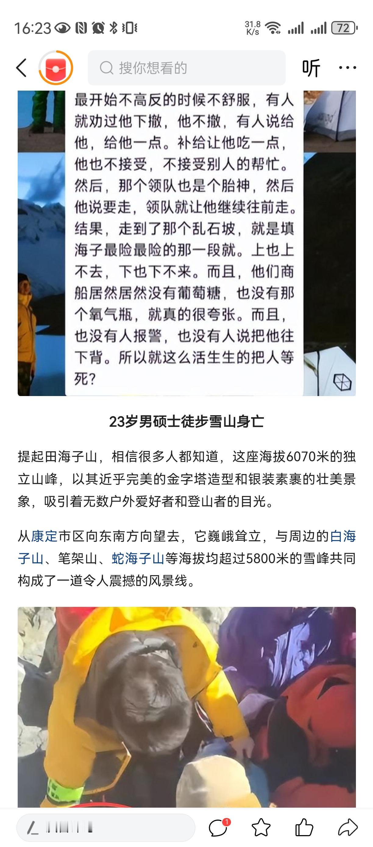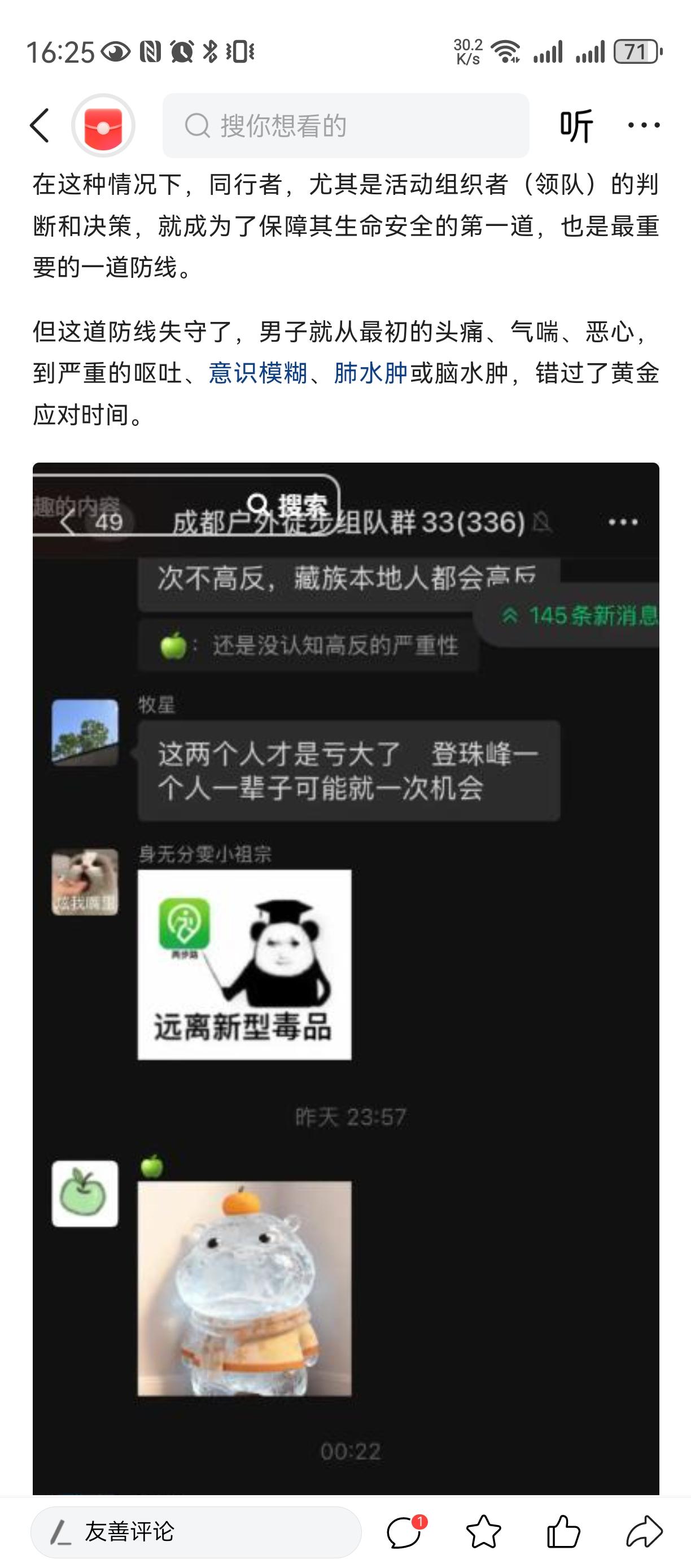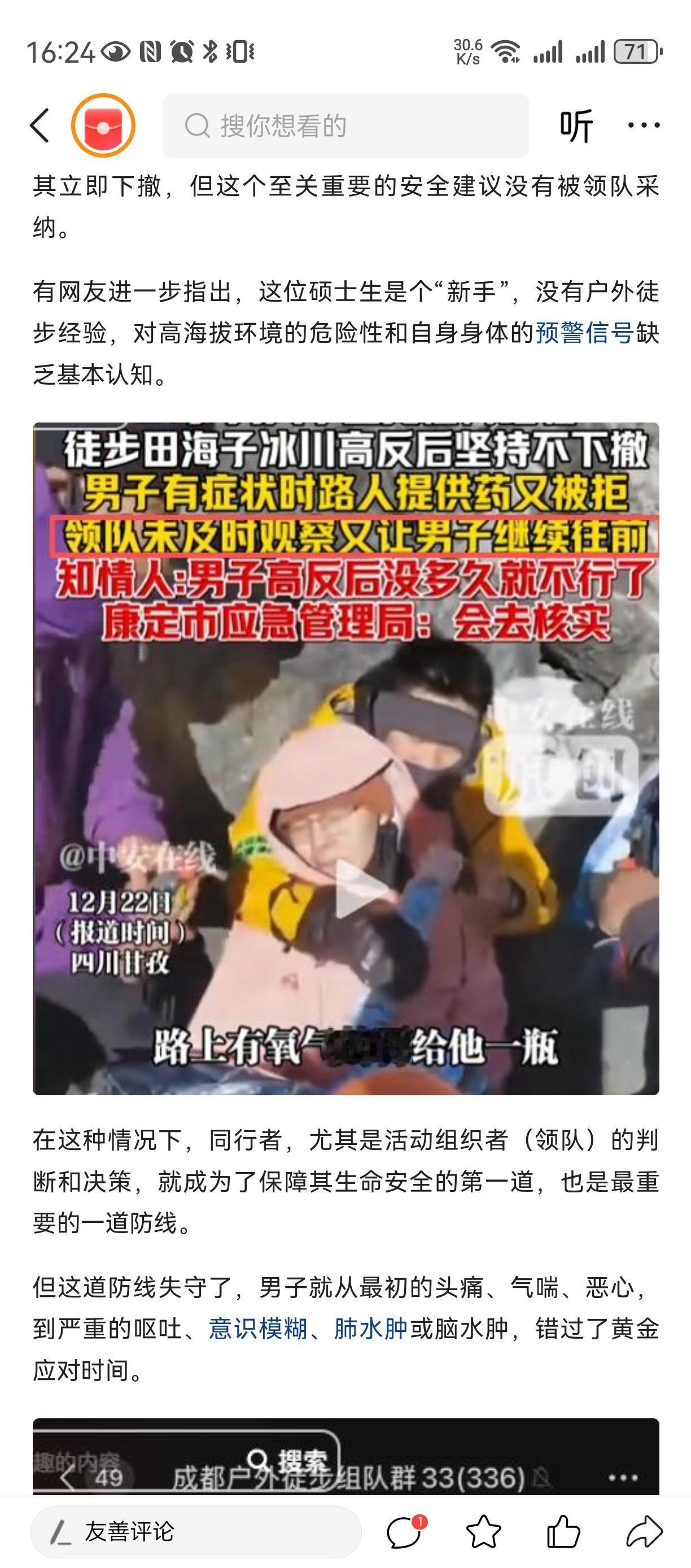 学会认怂[祈祷][祈祷][祈祷] 自作孽不可活[祈祷][祈祷][祈祷] 莫怪命途多舛 我说那些自然冒险家, 一定要明白自己几斤几两, 别人都在劝导去世小伙及朋友不要再爬了, 因为已经高原反应了, 是要人命的。 可是小伙还不认怂偏要逆天改命[祈祷][祈祷][祈祷] 甚至一度拒绝任何药物, 过度的自信(不讲科学)。 可惜了小伙[祈祷][祈祷][祈祷] 可怜他的父母亲人!莫攀他人境遇