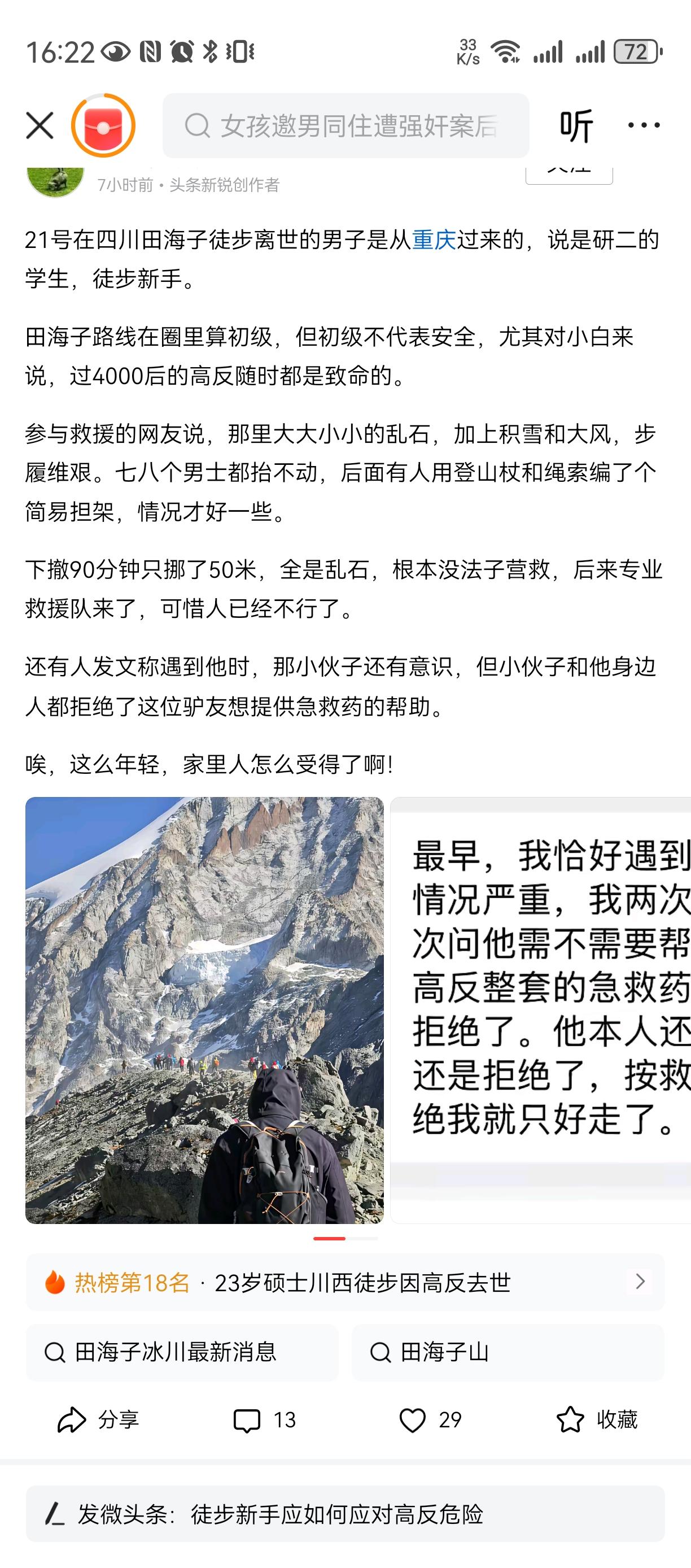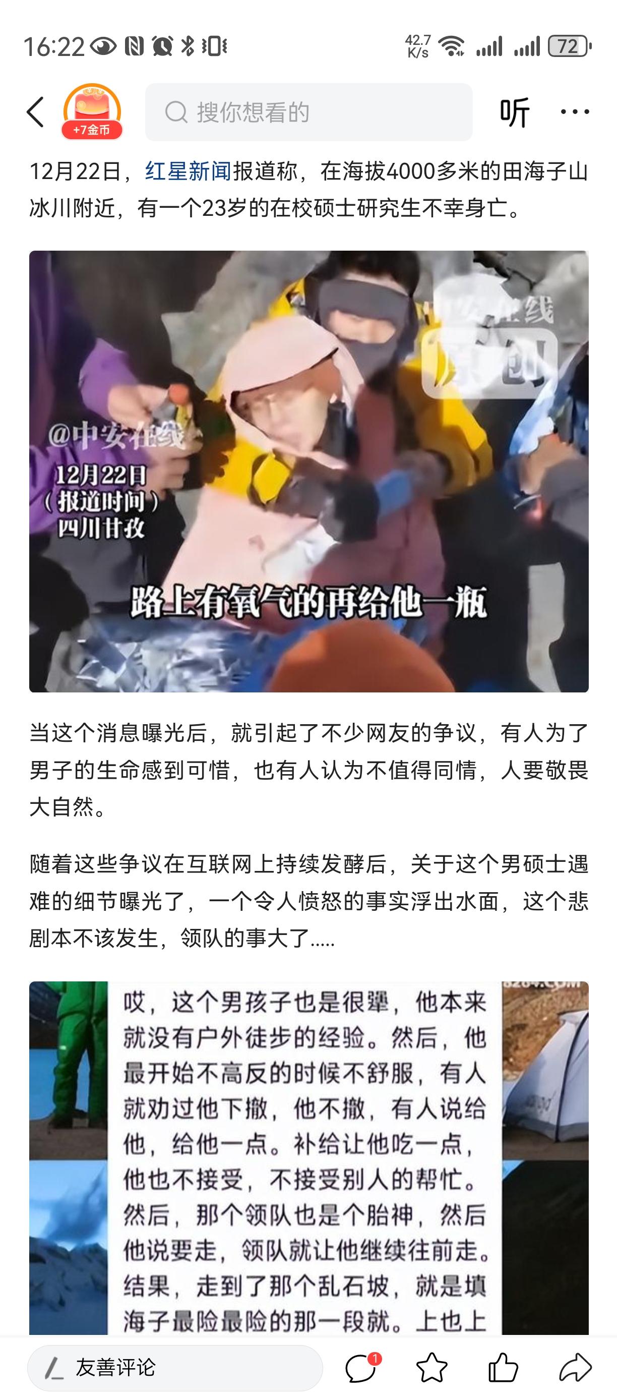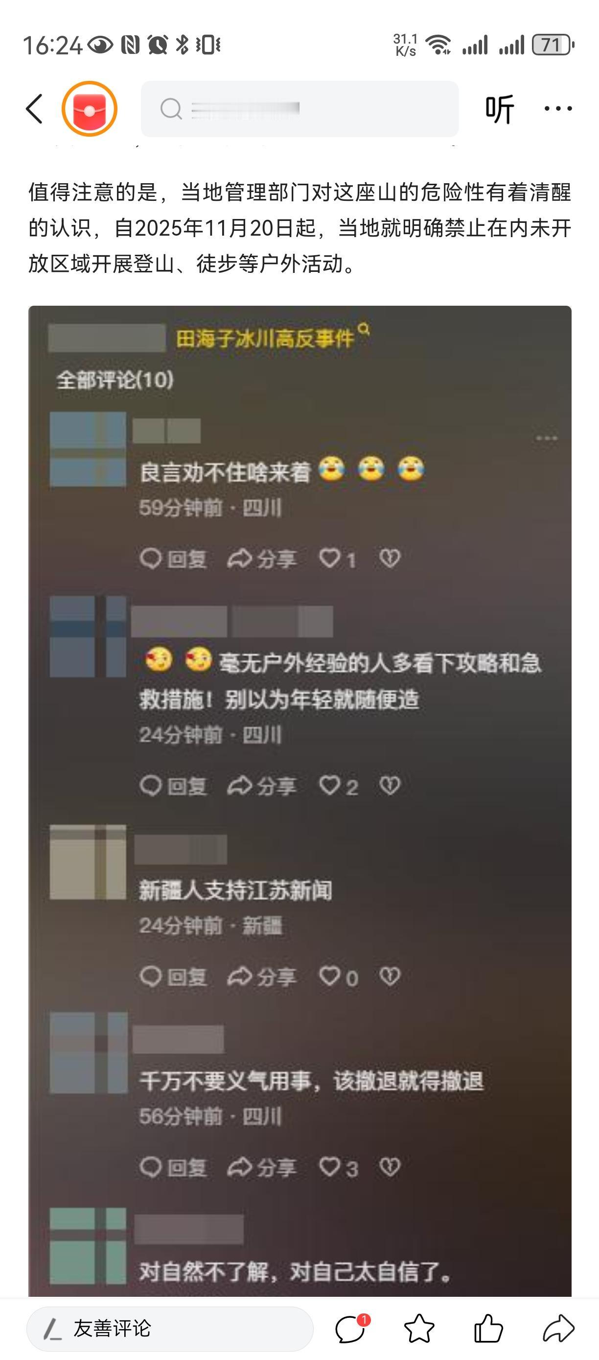 学会认怂[祈祷][祈祷][祈祷] 自作孽不可活[祈祷][祈祷][祈祷] 莫怪命途多舛 我说那些自然冒险家, 一定要明白自己几斤几两, 别人都在劝导去世小伙及朋友不要再爬了, 因为已经高原反应了, 是要人命的。 可是小伙还不认怂偏要逆天改命[祈祷][祈祷][祈祷] 甚至一度拒绝任何药物, 过度的自信(不讲科学)。 可惜了小伙[祈祷][祈祷][祈祷] 可怜他的父母亲人!莫攀他人境遇