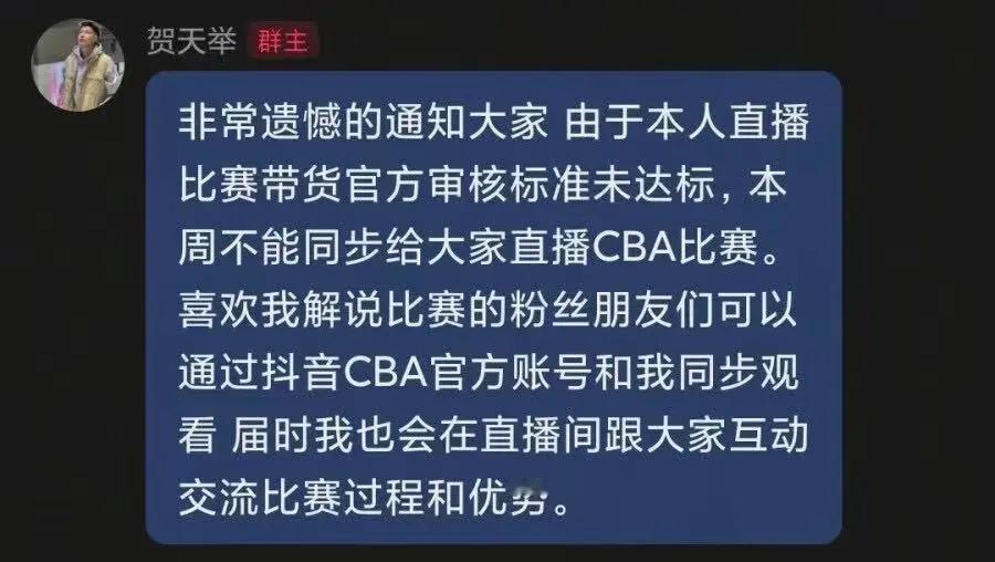 贺天举称因带货不达标暂不能解说CBA 球迷只想安安静静看球啊!贺天举专注解说不带货就被暂停权限,抖音这“电商+直播”模式也太卷了,难道以后看CBA还要被迫看带货?把解说变成了销售岗,专业的人就该做专业的事啊!