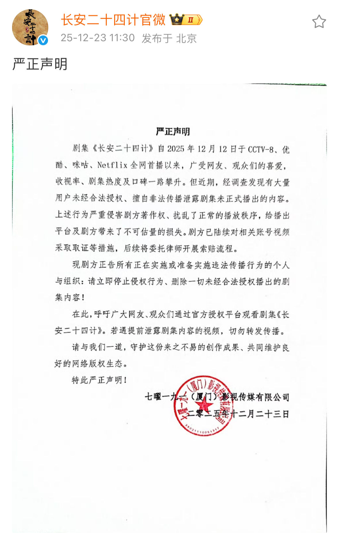 长安二十四计官方抵制盗版,这几年继人民的名字庆余年之后,又一爆剧被泄露资源。泄露未播母带的,造成的损失不可估量,不管对这部剧还是整个长剧市场都是非常恶劣的行为,影响太大了。抵制盗版,守护高质量的国产长剧。不管哪方的责任,一定要严查。平台要抓内鬼啦,敌人就在内部,谁这么害怕这部剧啊。