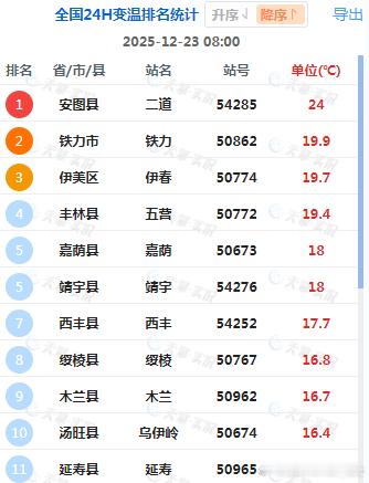 【东北气温骤升】昨晚到今晨,东北地区因为云层保暖+南风暖平流托举,气温同比出现大幅上升。今天8时对比昨天8时,吉林二道升24℃、黑龙江铁力升19.9℃、辽宁西丰升17.7℃,为各自省份8时升温最强站点。沈阳和哈尔滨在昨夜到今天凌晨,都出现了气温不降反升的反常规走势。