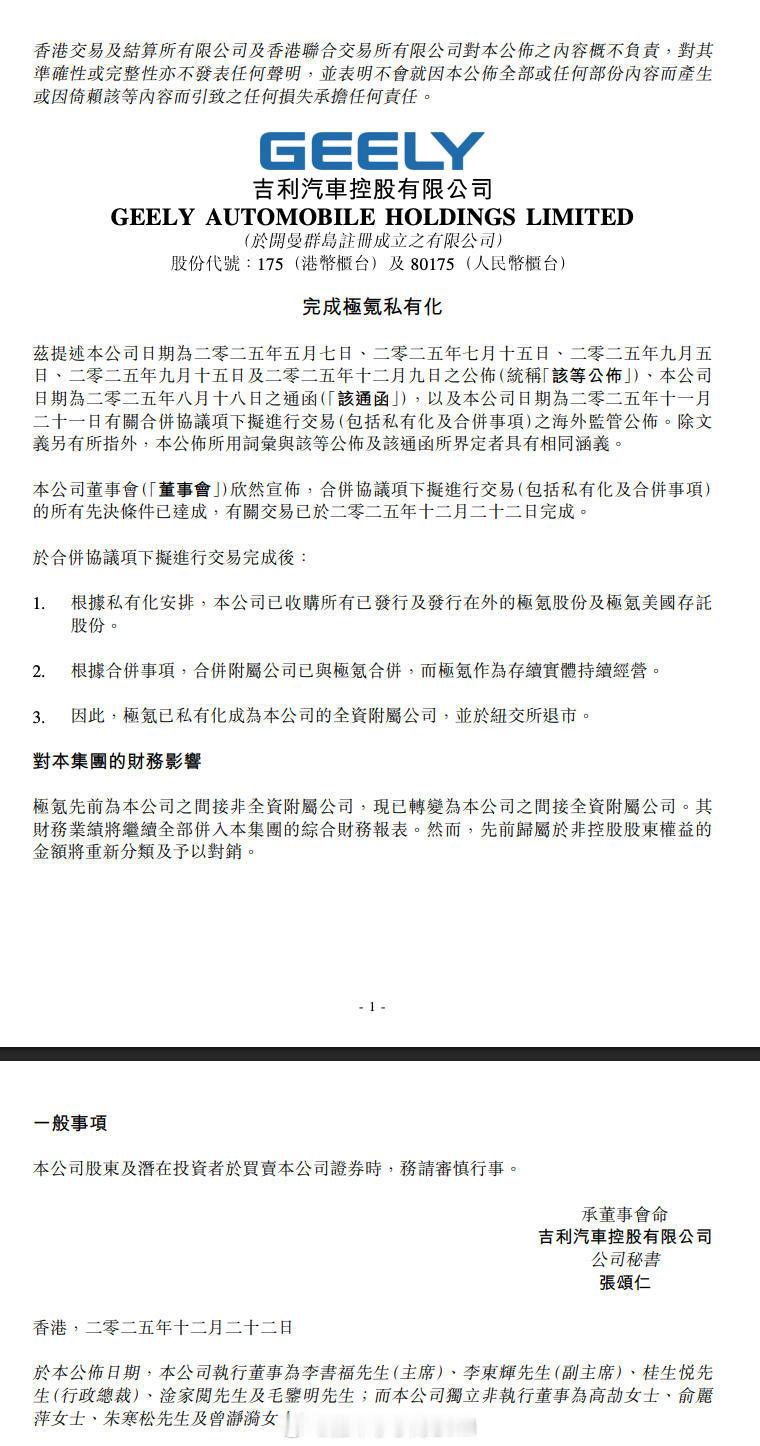 吉利汽车与极氪合并交易完成极氪退市了,现在是一个吉利了。12月22日晚间,吉利发布公告,正式宣布已完成对极氪的私有化及合并交易。极氪成为吉利汽车的全资附属公司,并从纽约证券交易所退市。这场始于今年5月的整合计划,在历时7个月后终于尘埃落定。作为吉利孵化的高端纯电品牌,极氪四年间完成了从内部孵化、独立运营到赴美上市再回归母体的完整发展周期。极氪从成立到上市仅用37个月,创下造车新势力最快IPO纪录。现在退市也是为了更好发展,极氪表示,通过整合,极氪研发投入将降低10%至20%,BOM成本将降低5%至8%,产能利用率提升3%至5%,营销服管理费用降低10%至20%。11月份,极氪的销量为25452辆,在新势力中也属于前列,看看回归一个吉利后,能不能做得更好吧汽场全开极氪