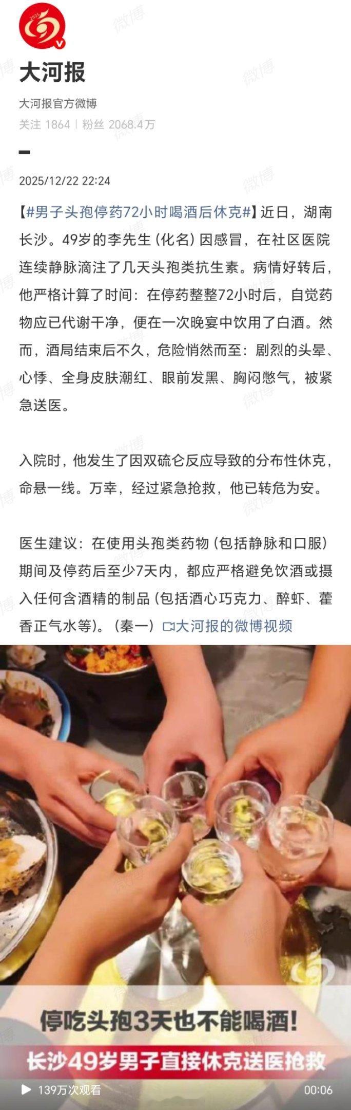 男子头孢停药72小时喝酒后休克人算不如药算,总以为三天七十二小时够交规了,没曾想身体里还藏着个终身质保的酒精检测仪。科学建议七天,像极了考驾照时教练吼的那句“多看后视镜”——你以为瞟过了,实际并线时盲区里永远有辆电动车。现代人活得像个精算师,感冒输液卡着秒表停药,酒局上却敢把命押给“我觉得代谢完了”。医学用休克给你划重点:有些交规不看驾龄,只看你还剩多少血条。藿香正气水都比你会看说明书。建议以后头孢说明书印在酒瓶盖上,毕竟醉虾不会告诉你,这局赌的是救护车来得快,还是代谢曲线拐得陡。