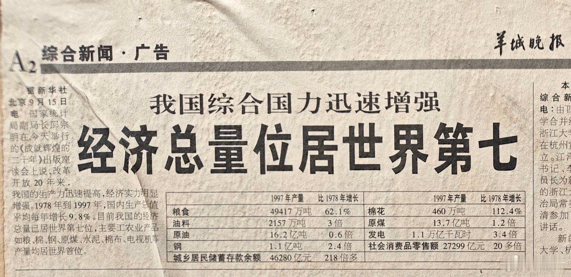 在饭店墙上偶然发现一张1998年的羊城晚报,那时中国经济总量还排在世界第七。转眼2025年,我们已是世界第二!从追赶到领跑,这几十年的跨越,是中国人一步一个脚印拼出来的!身为中国人,很难不骄傲❤️ 祖国万岁!身为中国人我骄傲