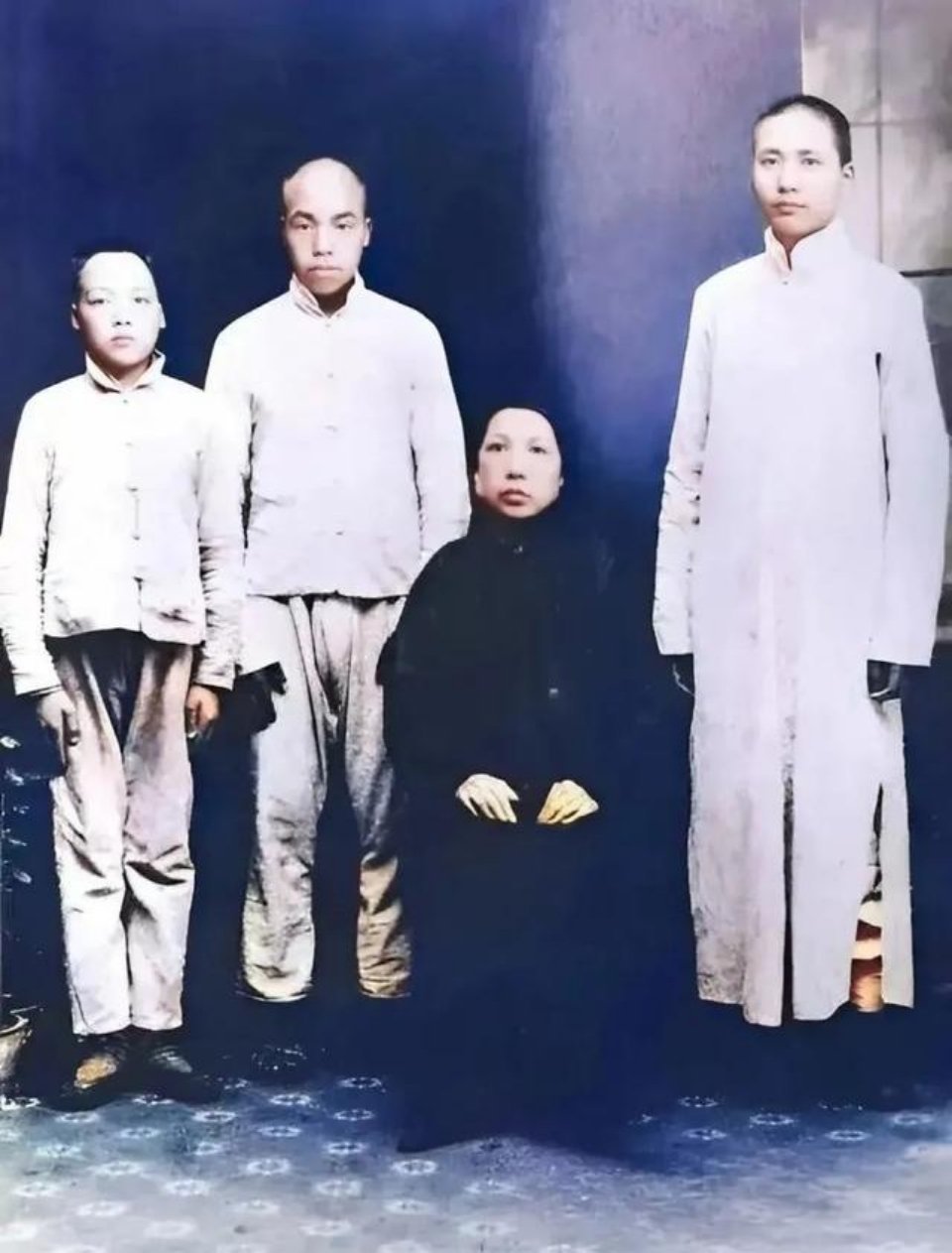 伟人一家的合影: 拍摄于1919年春,湖南长沙荣湾镇照相馆。左起:毛泽覃,毛泽民,母亲文七妹,毛泽东!