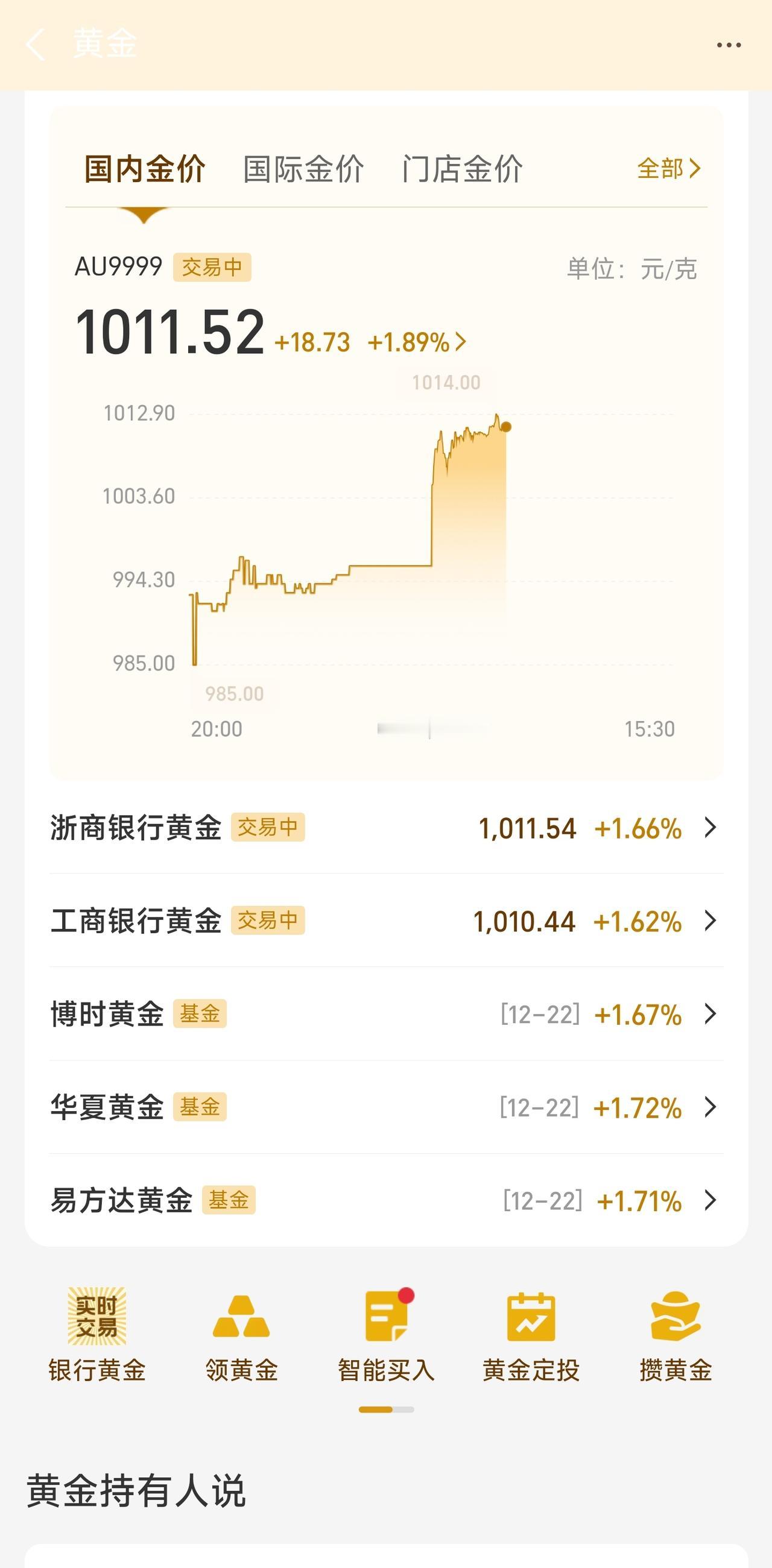 黄金突破1000了,还能不能买?是不是已经到顶了? 经过昨天和今天的大涨,黄金终于突破1000了。 记得我刚开始关注黄金的时候,他还在270一克。 只可惜我只是一个普通人,没有那么远的目光。记得我当时买了一块钱的,后来涨到了1块5毛钱。我都没有意识到,这个东西那么赚钱,都没有下重金。 都是人,挣不到认知以外的钱,这句话说的真的是太对了,我当时真的对这方面认知严重不足。 后来我还是在黄金上挣了一些钱的,不过前不久就全部卖掉了,因为还是挣了两点几。 没想到刚卖掉,就迎接来了两天的大涨,现在还能买吗?上涨到底涨到顶没有?