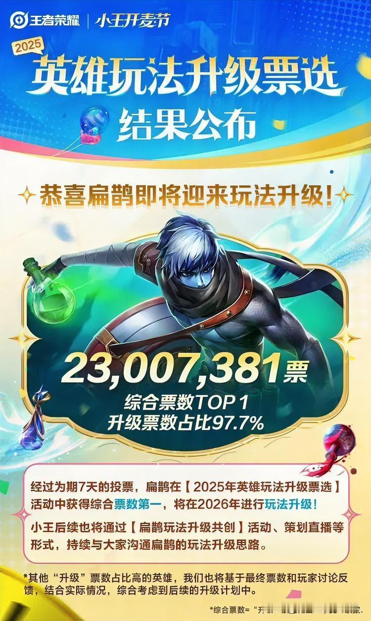王者荣耀 王者搞笑评论 王者的有几人 2025年王者荣耀英雄玩法升级票选结果已正式公布(12月16-23日),扁鹊以23,007,381票、97.7%升级占比拿下第一,将于2026年迎来玩法升级,官方后续会开启共创活动与策划直播沟通升级思路。 榜首:扁鹊,综合票2300.7万,升级占比97.7%,2026年升级,路人局长期T4、出场率低,核心痛点是无位移/控制、手短、机制落后。 - 第二名:达摩,约1438万票,升级占比97.5%,痛点为2技能易被拉扯、大招联动限制多,优化方向含大招回退两段。 - 第三名:上官婉儿,约1380万票,升级占比94.9%,路人局强度尚可,部分玩家希望优化操作与容错。 - 末位:太乙真人(151万)、蒙恬(197万)、鲁班大师(221万),职业赛场强势但路人局登场率低,优先级靠后。 - 规则与后续:投票面向2024年前上架、11月巅峰赛/顶端排位登场率<6%的英雄;除扁鹊外,其他高票英雄会结合实际情况纳入后续升级计划。