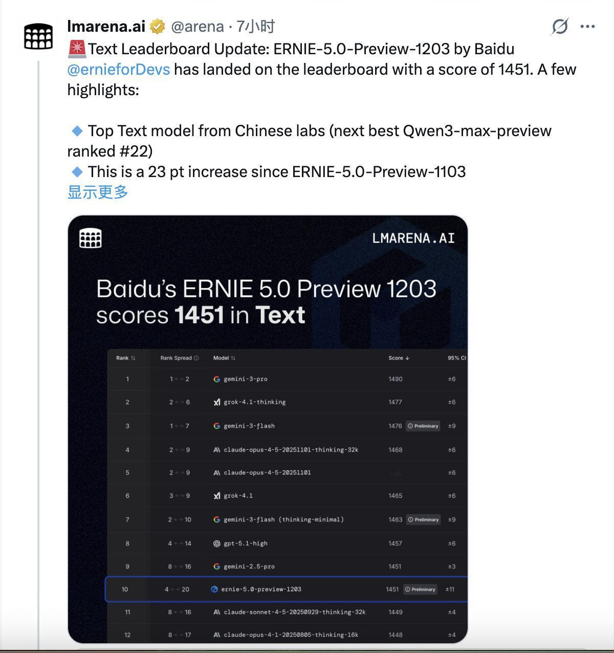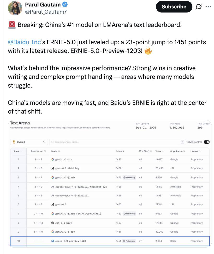 当中国模型开始掌控AI行业节奏 如果你最近经常关注LMArena等知名国际模型榜单,可能会发现一个现象:以文心、DeepSeek、千问为代表的国产大模型的出现频率和排名稳定性,正在以一种清晰的“节奏感”向上走。 这不是孤立事件。回顾近期: 从11月至今,文心已多次在文本榜、视觉理解榜登顶国内第一。在12月23日的最新文本榜中,其评分较上一版本再次提升23分,不仅巩固了国内榜首地位,也进入了全球前列。连续数月在不同能力维度(文本、视觉)稳步亮相、分数节节攀升,这更像是一种有计划的“节奏型释放”。尤其考虑到,业内已有明确风声:文心大模型5.0的正式版,将于明年1月正式推出。将这两条线索串联起来,一个策略轮廓逐渐清晰:在正式版重磅登场之前,文心正在通过其“预览版”(Preview)进行一轮密集的、公开的“能力验证”。 这绝非简单的“刷存在感”。其背后逻辑颇具深意: 提前建立基准:通过Preview版本在权威公开榜单上反复测试,获取真实、客观的性能分数。这等于在正式发布前,就先行为产品锚定了一个能力基线,避免了“王婆卖瓜”的尴尬。 管理市场预期:连续良好的榜单表现,会像连续发布的预告片一样,在业界和用户心中逐步积累起对文心5.0能力的认知与期待。当正式版发布时,公众对其强大已有了心理准备,接受度更高。 收集反馈,迭代优化:公开评测本身就是最好的压力测试和反馈来源。在预览阶段暴露问题、进行调整,远比正式发布后再“打补丁”要稳妥得多。 因此,近期的“频繁上榜”,可以看作是一场精心策划的“上市前热身”。文心似乎在走一条更自信、也更聪明的路:不再追求发布会上的“一鸣惊人”,而是通过前期扎实的、可验证的公开表现,一步步抬高外界期待,为正式版的登场铺平道路。 这种操作,反映出中国AI企业在国际竞争中的策略成熟——技术实力的比拼,已经延伸到了发布节奏、市场沟通与预期管理的综合维度。当明年1月文心5.0正式版揭晓时,它需要做的或许已不再是证明自己,而是公布这一连串Preview努力背后的正式大招。 百度 文心一言 文心 文心大模型 AI AI大模型 科技 AI技术 干货分享