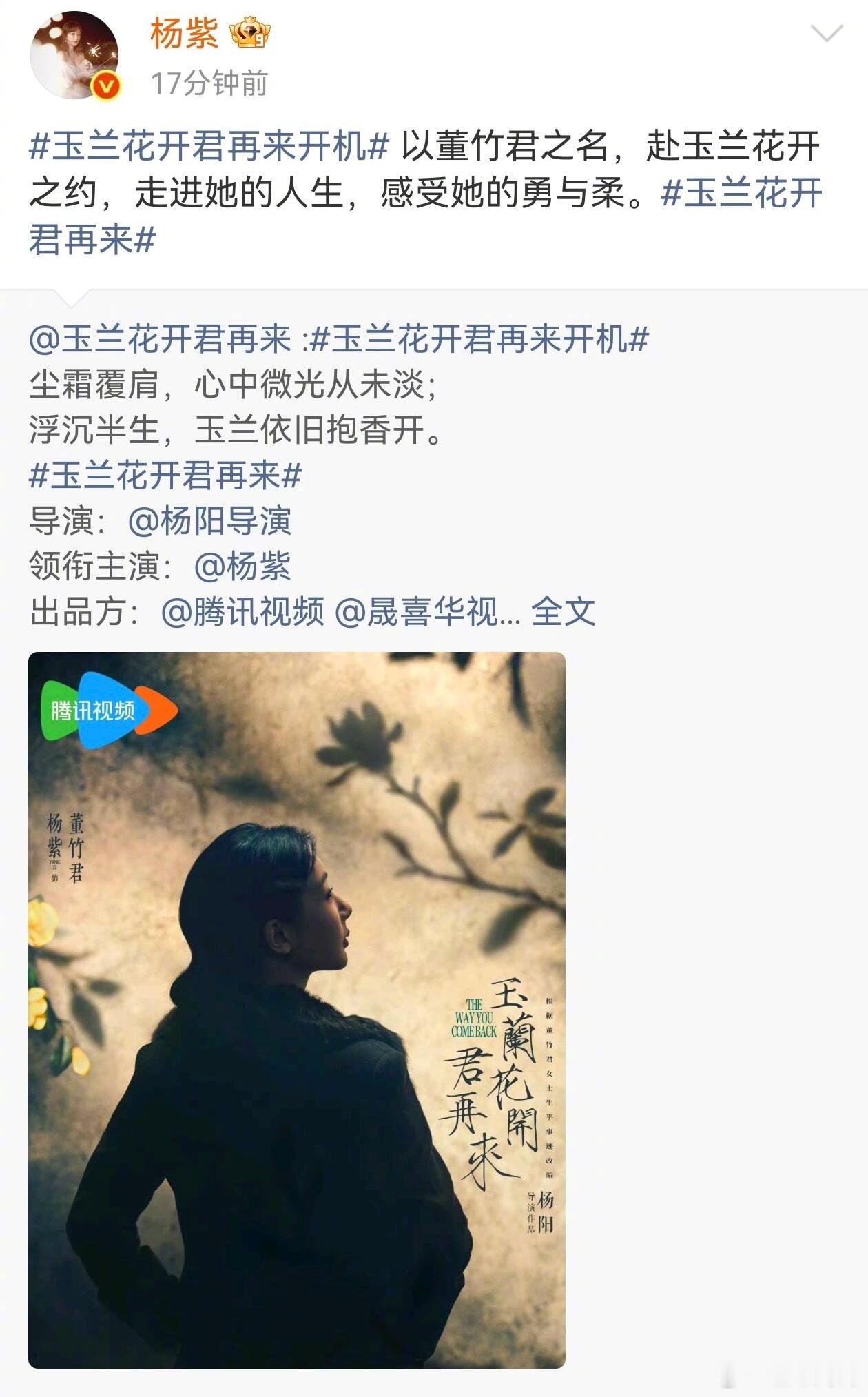 玉兰花开君再来开机预热杨紫《玉兰花开君再来》开机,光是一个背影故事感就出来了,像青松一样挺立 玉兰花开君再来杨紫欧豪官宣开机海报