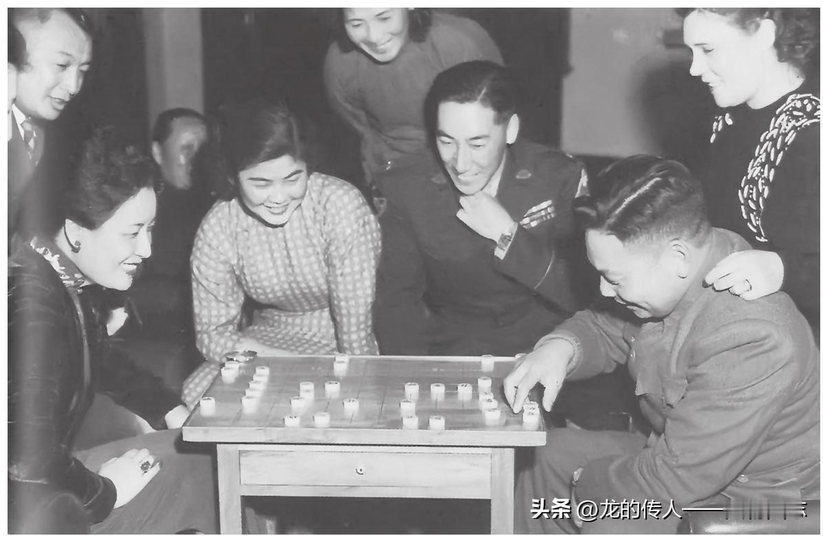 宋美龄生日聚会上,经国、纬国两夫妇陪蒋夫人下棋。左一为韦永成,左三为石静宜