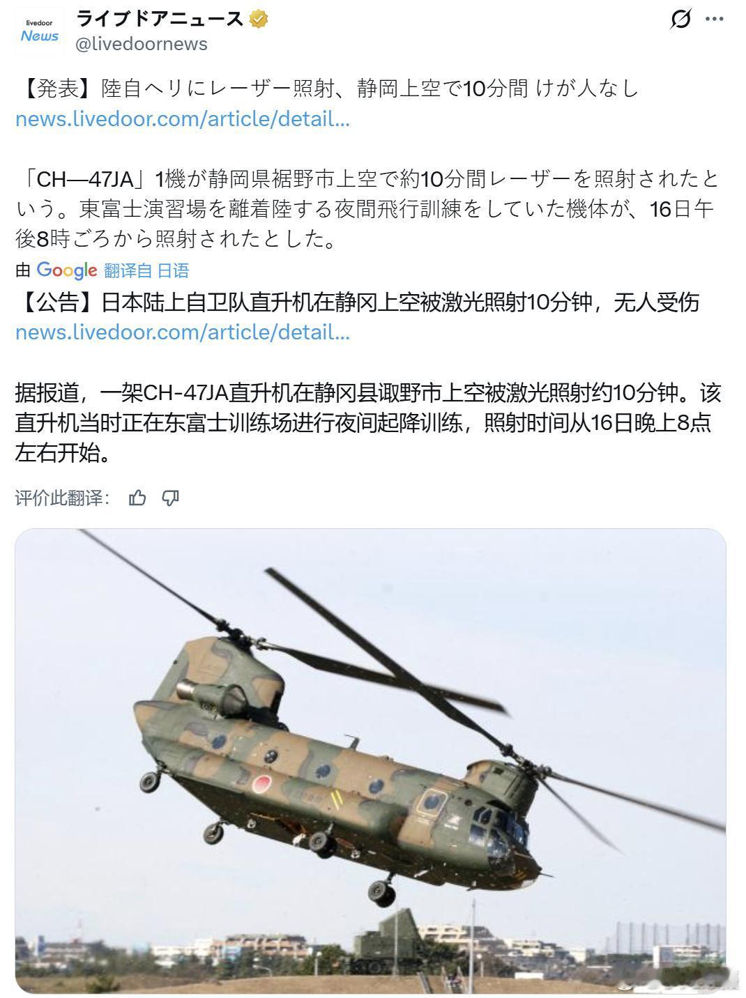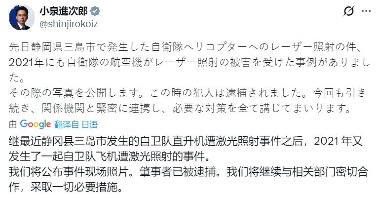日本右翼鬼子小泉進次郎今日发帖称,自卫队直升机遭激光照射后,肇事者已被逮捕。 此前,自卫队称12月16日和12月17日,静冈县上空连续发生两起针对直升机的激光照射事件。其中16日的事件尤为紧张,直升机遭受激光照射约10分钟。