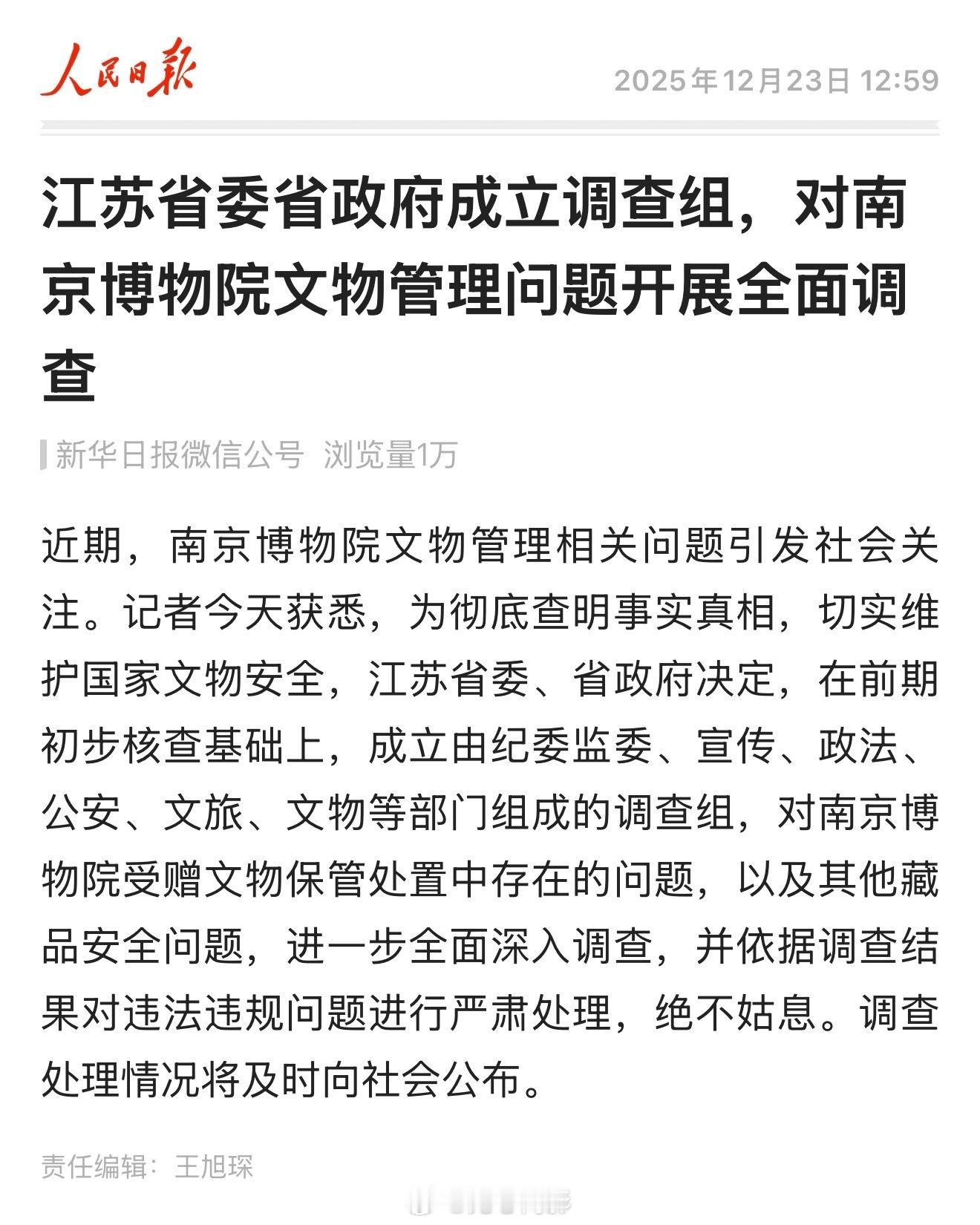 江苏省委省政府成立调查组,对南京博物院文物管理问题开展全面调查