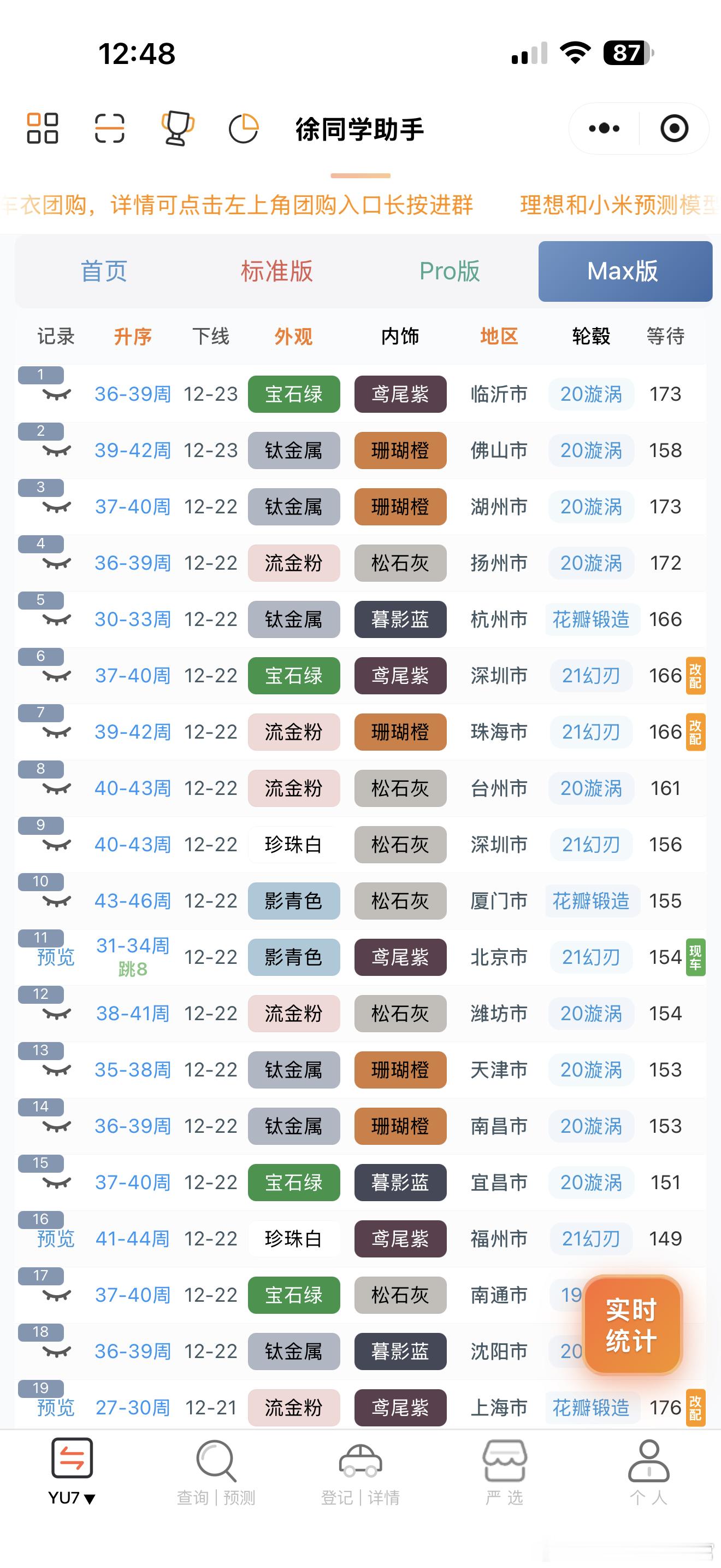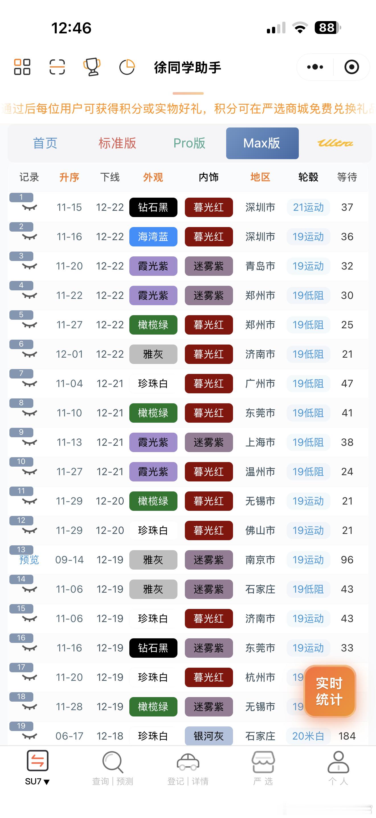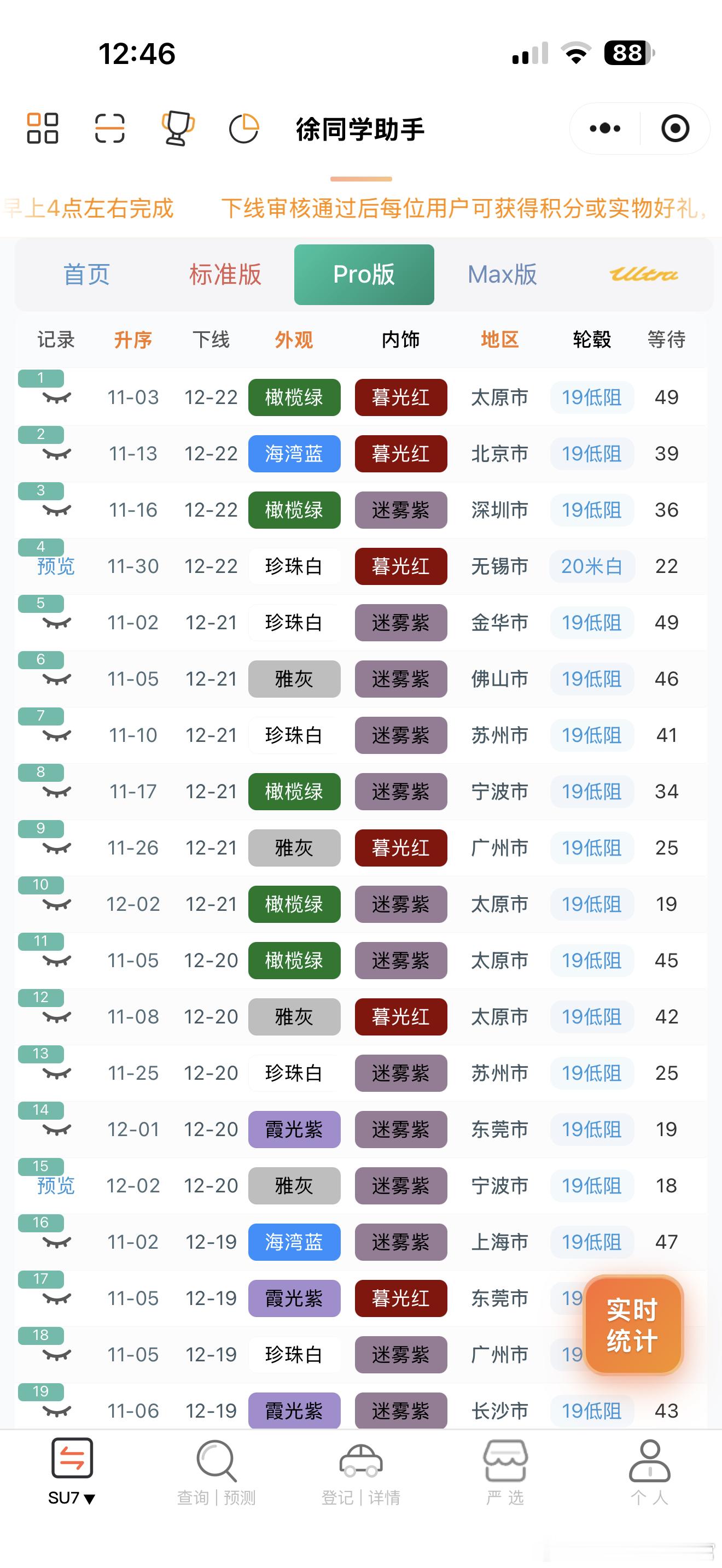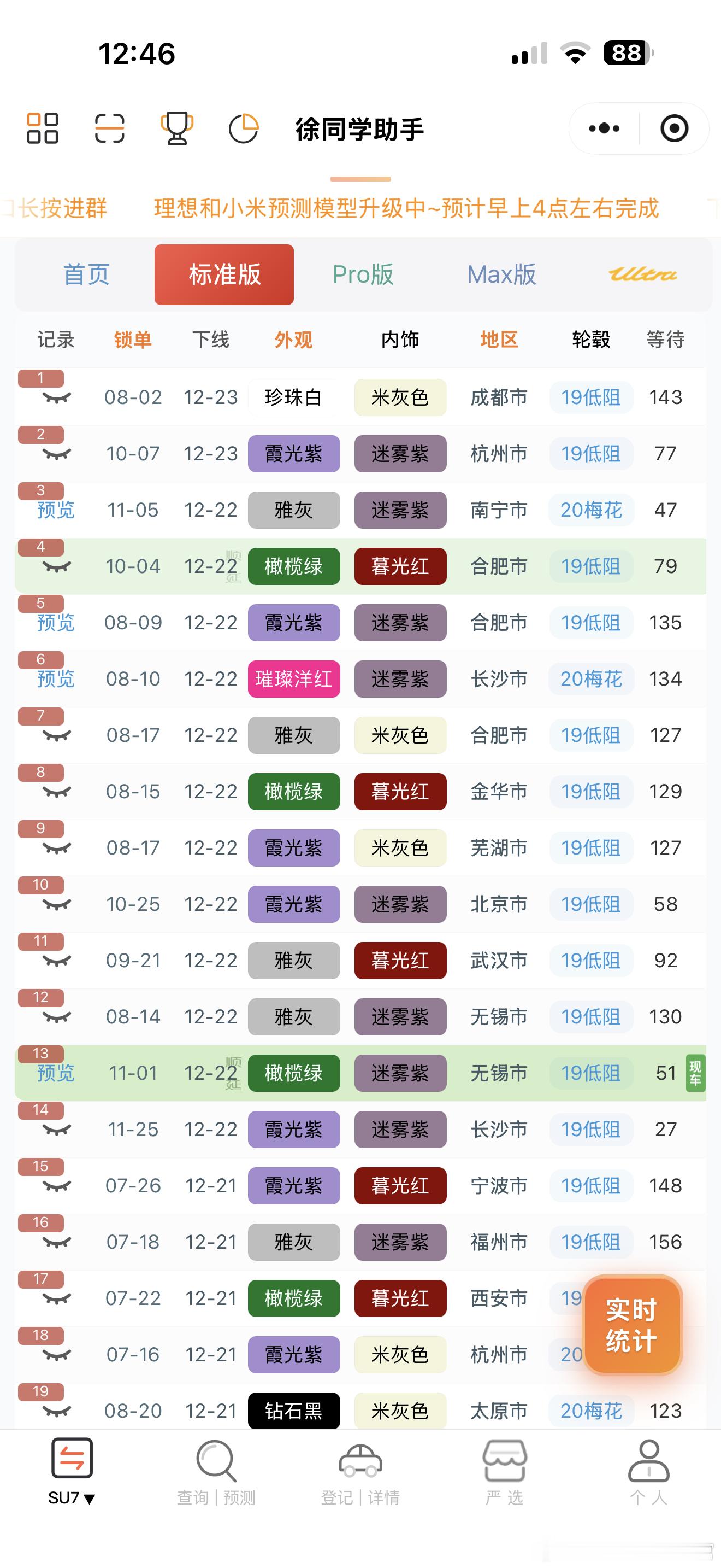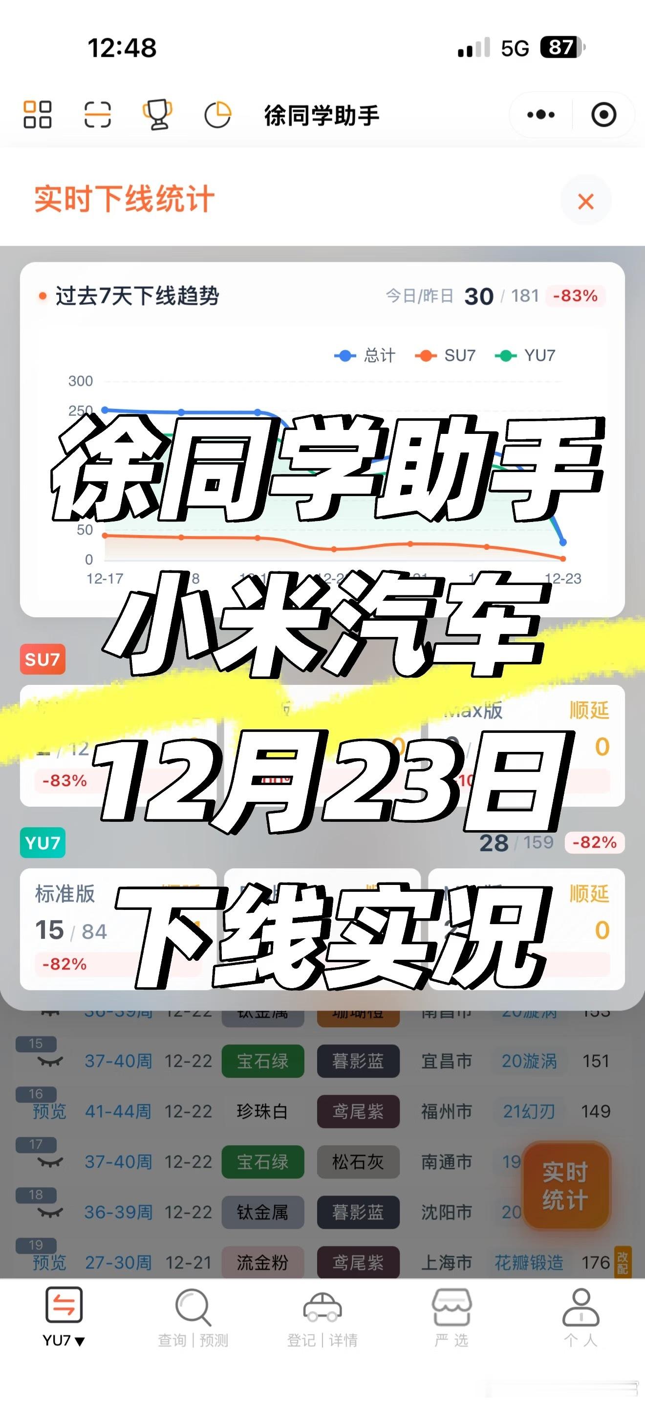 小米汽车(12月23日)下线实况现车选购26号就结束了,如果25号下线还有机会算作2026年的车,最晚可在1.1当天提车。1月份将面临高额购置税补贴支出,网传会放慢交付速度,但是就小米本身而言应该不会,得不偿失,所以仍旧会以正常速度下线(除去节假日,财务节点)2026年初各类补贴只增不减,预计会在1月中旬左右宣布,或者提前宣布~关于新购补贴,有些地区看发票,有些地区看订车时间🌀YU7(据不完全统计)合计159台1️⃣标准:下线84台,月底会下线一批提车意向高的,正常下线31周左右的,不急着提车的千万别催交付2️⃣Pro:下线59台,34周左右的随时下线,稀有色来了一批,26号以后的也在正常下线3️⃣Max:下线16台,以7月中下旬为主,订单还不少,一部分现车性价比还是挺高的🌀SU7(据不完全统计)合计22台,等新车了 期待一下5.2m加长款的行政级su7L更多关于小米汽车的最新资讯和深度解析,请参考【米车派】~徐同学助手小米汽车