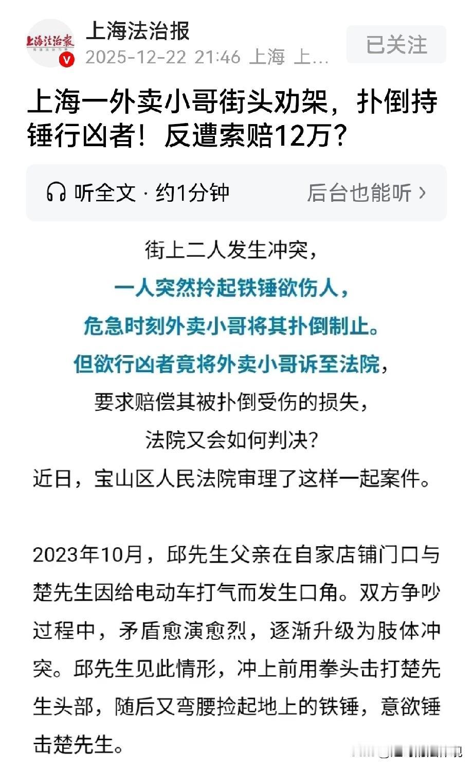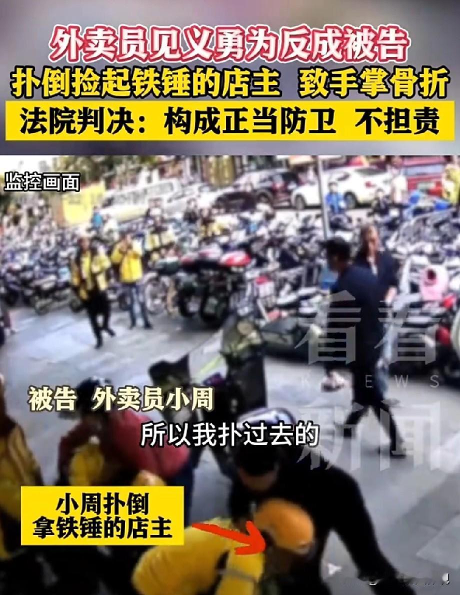 上海,一外卖小哥,去修车铺给电动车充气,和店主因1元钱发生口角,随后双方发生了肢体冲突,店主儿子上前用拳头击打外卖小哥的头部,又随手抄起一把铁锤,另一外卖员见状将其从身后扑倒,不成想,因此导致店主儿子的手骨折。对方将外卖小哥告上法庭,索赔12万元,并称拿铁锤是去修车,法院判决大快人心。 邱某的父亲,开了一家电动车维修店铺。 2023年10月的一天,两名外卖小哥,来车修车铺给电动车打气。 原来小刘正打算去送餐,电动车轮胎漏气了,想借店里的打气筒用一下。 开始双方说好,用一次1块钱,小刘的顾客正在催他,他赶紧拿起打气筒使用。 谁知,还没等他用,店主又不同意了,并从小刘手里把打气筒拿走。 小刘很生气,因为时间上的关系,他再去别的地方打气,还要耽误时间,就和店主吵了几句。 小刘认为,讲好的1块钱,我又不少给钱,为啥不让我用打气筒? 店主的脾气也上来了,我开的店,想让谁用谁就用,我不想让你用,你就走人得了。 小刘不服气,两人谁也不让谁,说着说着还动上了手。 同来的另一名外卖小哥小周,见状,赶紧上前劝架,想拉着同事离开。 但双方谁也不松手,就在这时候,店主的儿子邱某从外面冲过来。 他不但不上前将二人拉开,反而冲过去朝小刘的头部就是了一记老拳。 小刘还没反应过来,邱某弯腰从地上捡起一把铁锤,就要锤打小刘。 在一旁劝架的小周见状,来不及多想,上前一个虎扑将邱某扑倒,并从后从后边把他紧紧抱住。 不料,邱某的手正好硌在铁锤上,导致手掌骨折了。 这下邱某不干了,他称自己打了小刘一拳后,没想再怎么着,自己拿铁锤是想去修车。 而另一名外卖小哥,以为自己拿铁锤去打他的同事,不问青红皂白,上来就将自己猛的扑倒,还死死抱住。 导致自己的手掌,按在铁锤上,硌伤后导致严重骨折。 事后不但花费了医疗费,还耽误了工作,等于自己又花钱又受罪。 邱某觉得自己太冤了,于是将小周告上法庭,索赔医药费、误工费,及各项费用共计12万余元。 法庭上,小周辩称,当时自己看到邱某弯腰拿起铁锤,身体估计比大脑反应的都快,上前将邱某扑倒。 如果这事自己不管,当时双方都在气头上,铁锤要是抡上去,无论打在小刘哪个地方都得受伤,轻则骨折,重则要命。 真到那时候一个进医院,一个被抓。 当时是急中生智,自己对邱某受伤的事实不存在主观故意。 法院在审理后认为,邱某在双方产生纠纷时,本应该上前劝阻,但他却直接上前动手殴打外卖小哥。 激发了矛盾和冲突,拿铁锤去修车的说法,与他在警方那里的陈述,以及现场的目击人员的陈述相悖。 法院认为,邱某捡铁锤时,正在拳击小刘的头部,其所陈述的突然停手拿铁锤去修车,严重违背了常理。 如果当时小周不阻止这起事件,可能会造成更严重的后果。 小刘可能会受到严重的伤害。邱某需承担所造成的后果和法律责任。 小周这一扑,不但保护了同事,还挽救了邱某。 小周的行为,构成正当防卫,不承担民事责任。 《民法典》第181条:“因正当防卫造成损害的,不承担民事责任。 正当防卫超过必要的限度,造成不应有的损害的,正当防卫人应当承担适当的民事责任。” 店主儿子邱某,在冲突中先拳击外卖员小刘头部,随后捡起铁锤欲实施进一步攻击,属于正在进行的不法侵害行为。 外卖员小周在紧急情况下,为阻止邱某持铁锤可能造成的重伤或死亡后果,采取扑倒动作,符合防卫的紧迫性和必要性。 尽管邱某因扑倒,导致手部骨折,但铁锤攻击的潜在危险性极高,小周的防卫行为未明显超出制止侵害所需的合理范围。 法院认定其行为未过当,因此无需承担民事责任。 法律鼓励公民,在面对不法侵害时,挺身而出保护自己或他人。 本案中,小周的行为不仅保护了同事小刘的生命安全,也避免了邱某因暴力行为可能面临的刑事处罚。 《刑法》第20条:“为了使国家、公共利益、本人或者他人的人身、财产和其他权利免受正在进行的不法侵害,而采取的制止不法侵害的行为,对不法侵害人造成损害的,属于正当防卫,不负刑事责任。” 虽然本案为民事纠纷,但法院在认定正当防卫时,参考了刑事法律标准。 邱某持铁锤攻击的行为,已涉嫌刑事犯罪,小周的防卫行为客观上也阻止了更严重的刑事后果发生。 法院通过民事判决,进一步明确,正当防卫不仅适用于保护自身权益,也适用于保护他人权益。 法律对正当防卫的保护是全方位的。 即使防卫行为导致侵害人受伤,只要符合“制止不法侵害”的目的且未明显过当,防卫人无需承担法律责任。 法院判决小周不承担责任,核心依据是,民法典第181条对正当防卫的支持,以后做好事不用怕了。 最终,法院判决,小周扑倒张某的行为,构成正当防卫,不承担民事责任,驳回张某的全部诉讼请求。 对此,你怎么看? 关注@赵哥的法律观,明辨是非不上当。